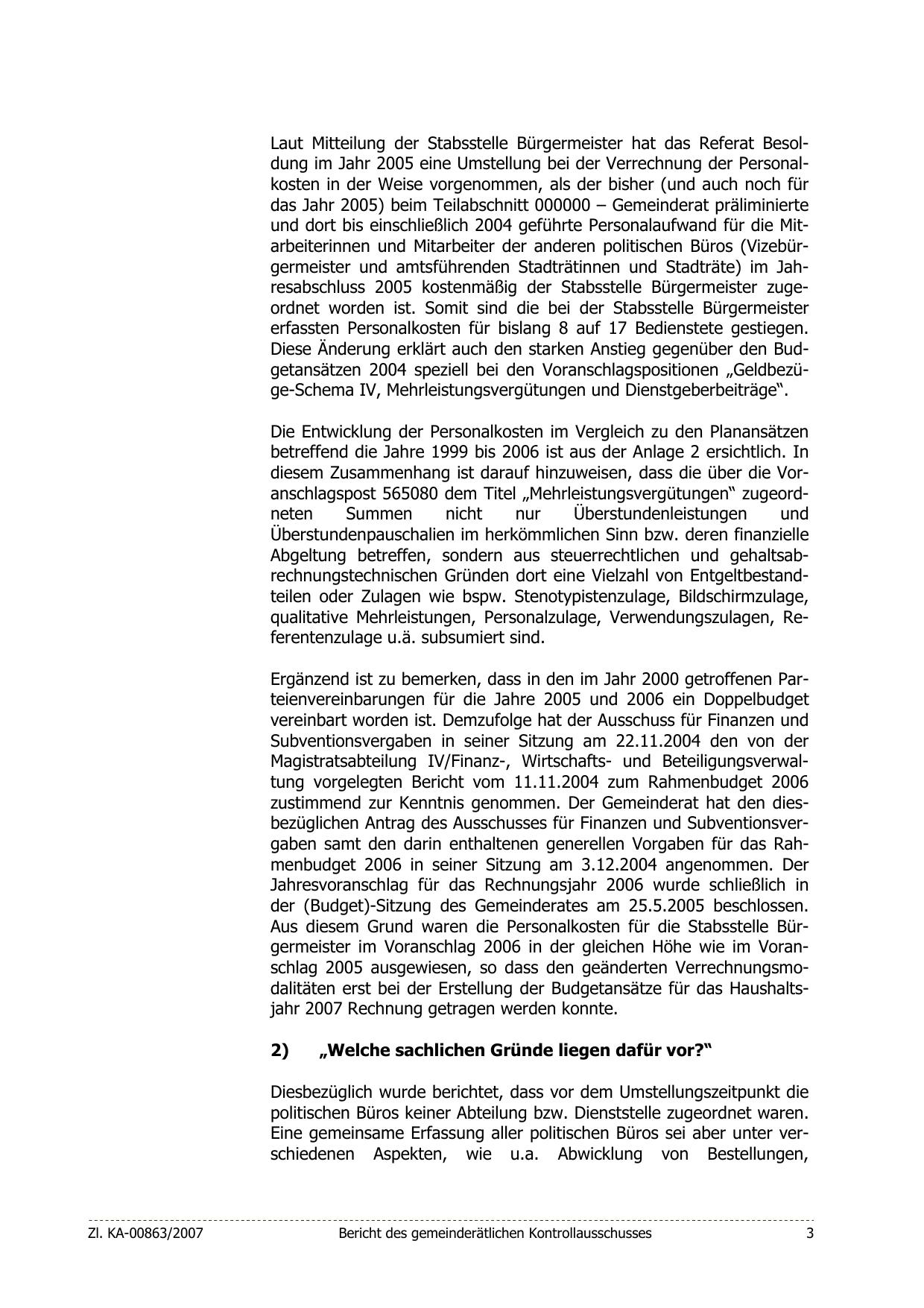 Laut Mitteilung der Stabsstelle Bürgermeister hat das Referat Besoldung im Jahr 2005 eine Umstellung bei der Verrechnung der Personalkosten in der Weise vorgenommen, als der bisher (und auch noch für