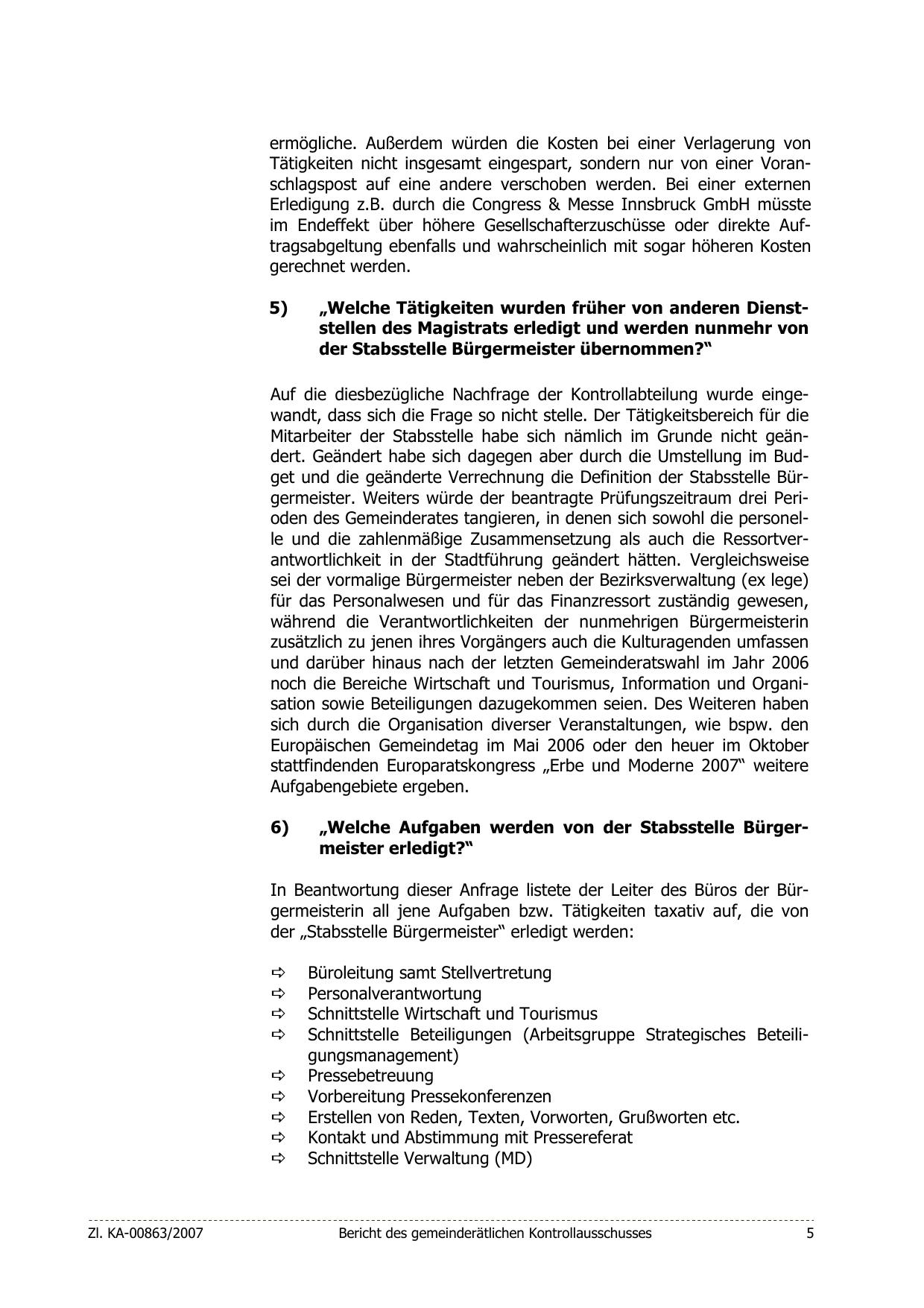 Mitarbeiter der Stabsstelle habe sich nämlich im Grunde nicht geändert. Geändert habe sich dagegen aber durch die Umstellung im Budget und die geänderte Verrechnung die Definition der Stabsstelle Bürgermeister. Weiters würde der beantragte Prüfungszeitraum drei Perioden des Gemeinderates tangieren, in denen sich sowohl die personelle und die zahlenmäßige Zusammensetzung als auch die Ressortverantwortlichkeit in der Stadtführung geändert hätten. Vergleichsweise