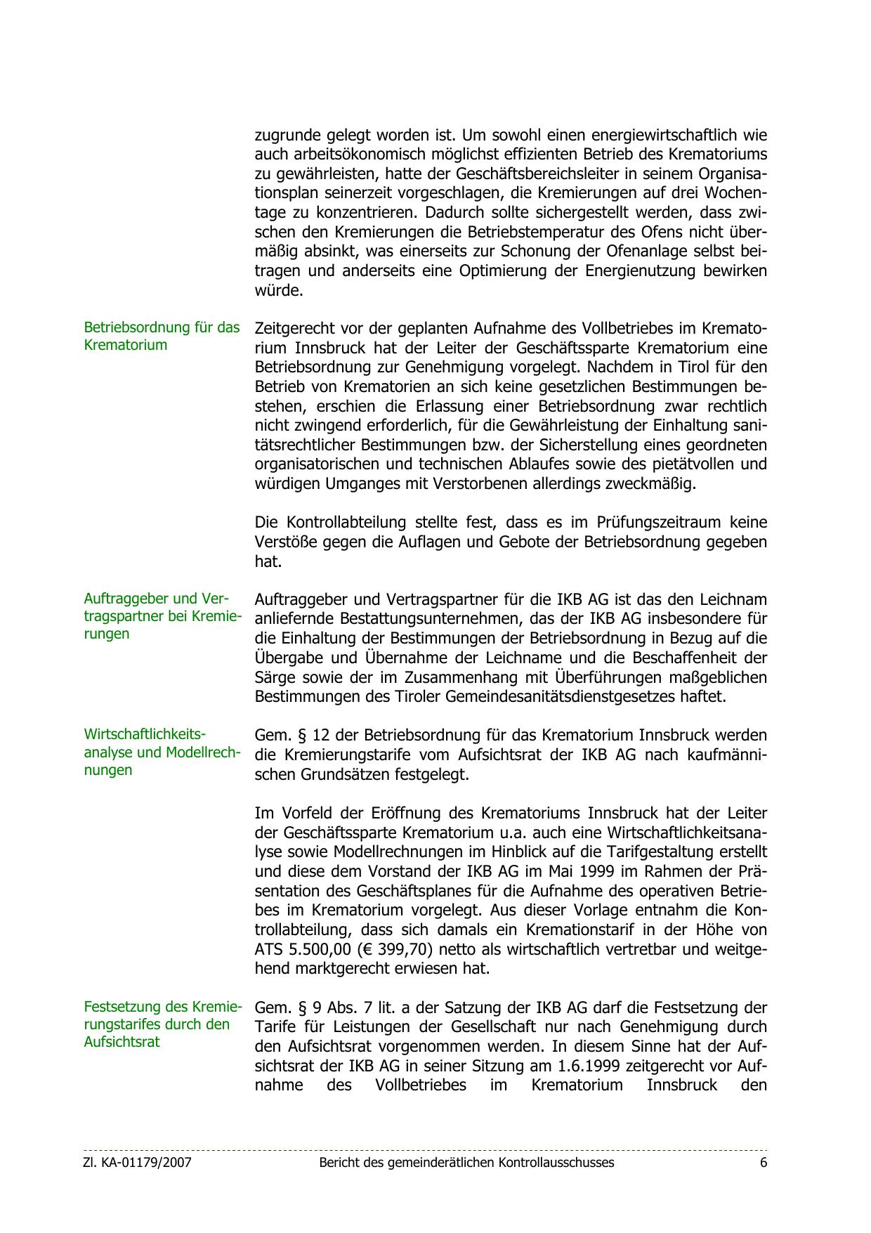 sichtsrat der IKB AG in seiner Sitzung am 1.6.1999 zeitgerecht vor Aufnahme des Vollbetriebes im Krematorium Innsbruck den