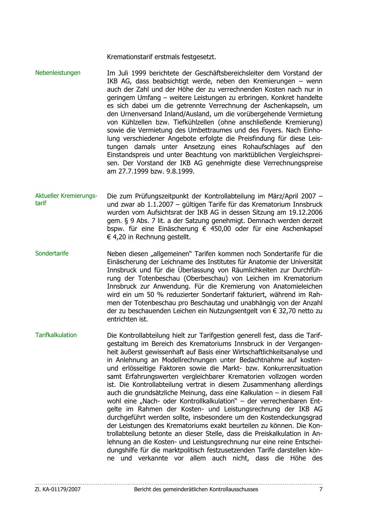 Die Kontrollabteilung hielt zur Tarifgestion generell fest, dass die Tarifgestaltung im Bereich des Krematoriums Innsbruck in der Vergangenheit äußerst gewissenhaft auf Basis einer Wirtschaftlichkeitsanalyse und