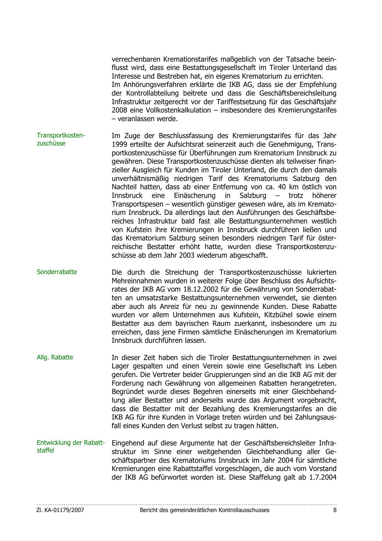 Eingehend auf diese Argumente hat der Geschäftsbereichsleiter Infrastruktur im Sinne einer weitgehenden Gleichbehandlung aller Geschäftspartner des Krematoriums Innsbruck im Jahr 2004 für sämtliche