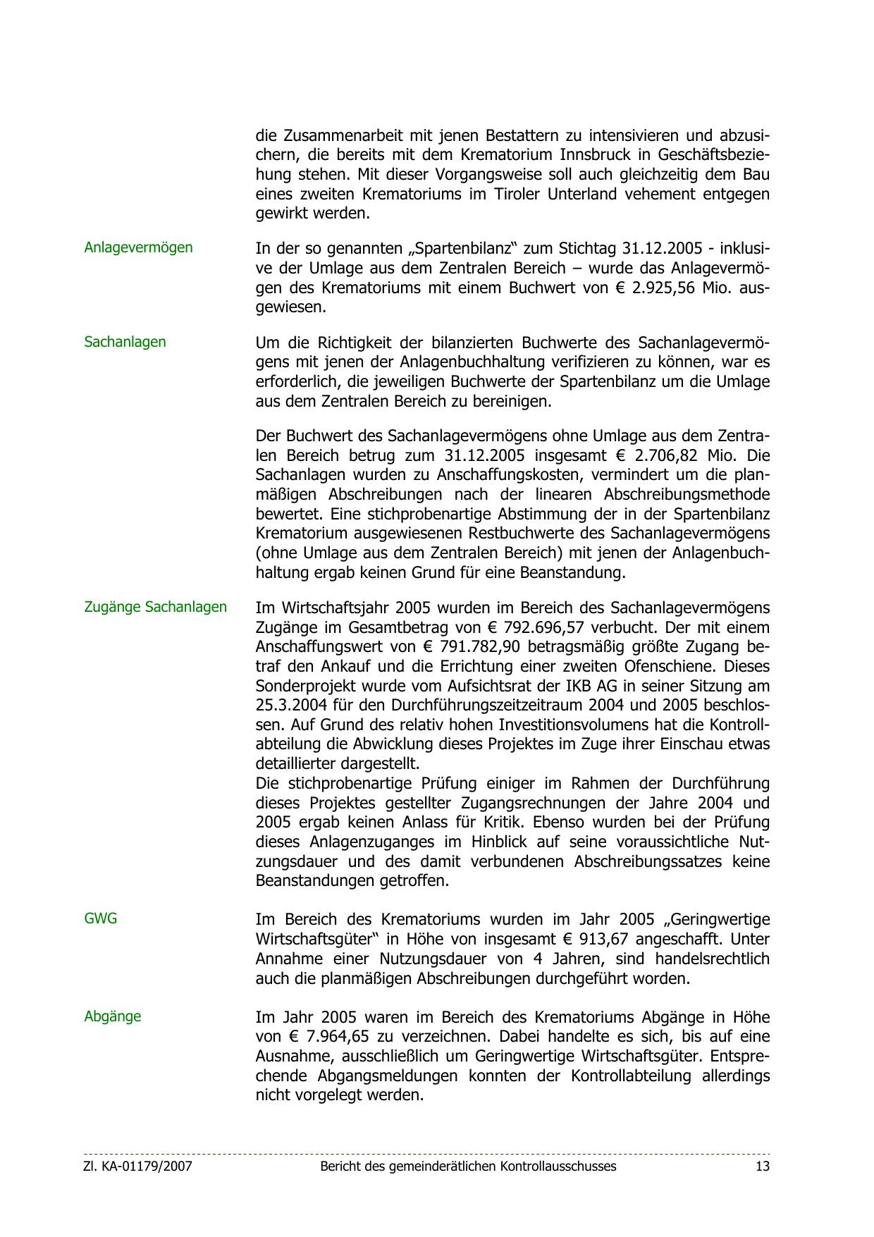 In der so genannten „Spartenbilanz“ zum Stichtag 31.12.2005 - inklusive der Umlage aus dem Zentralen Bereich – wurde das Anlagevermögen des Krematoriums mit einem Buchwert von € 2.925,56 Mio. ausgewiesen.
