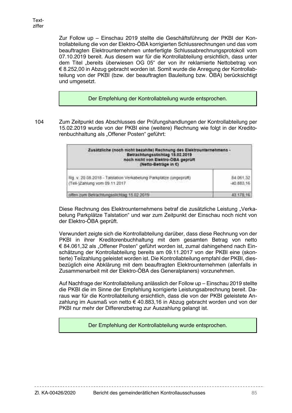 € 84.061,32 als „Offener Posten“ geführt worden ist, zumal dahingehend nach Einschätzung der Kontrollabteilung bereits am 09.11.2017 von der PKBI eine (skontierte) Teilzahlung geleistet worden ist. Die Kontrollabteilung empfahl der PKBI, diesbezüglich eine Abklärung mit dem beauftragten Elektrounternehmen (allenfalls in