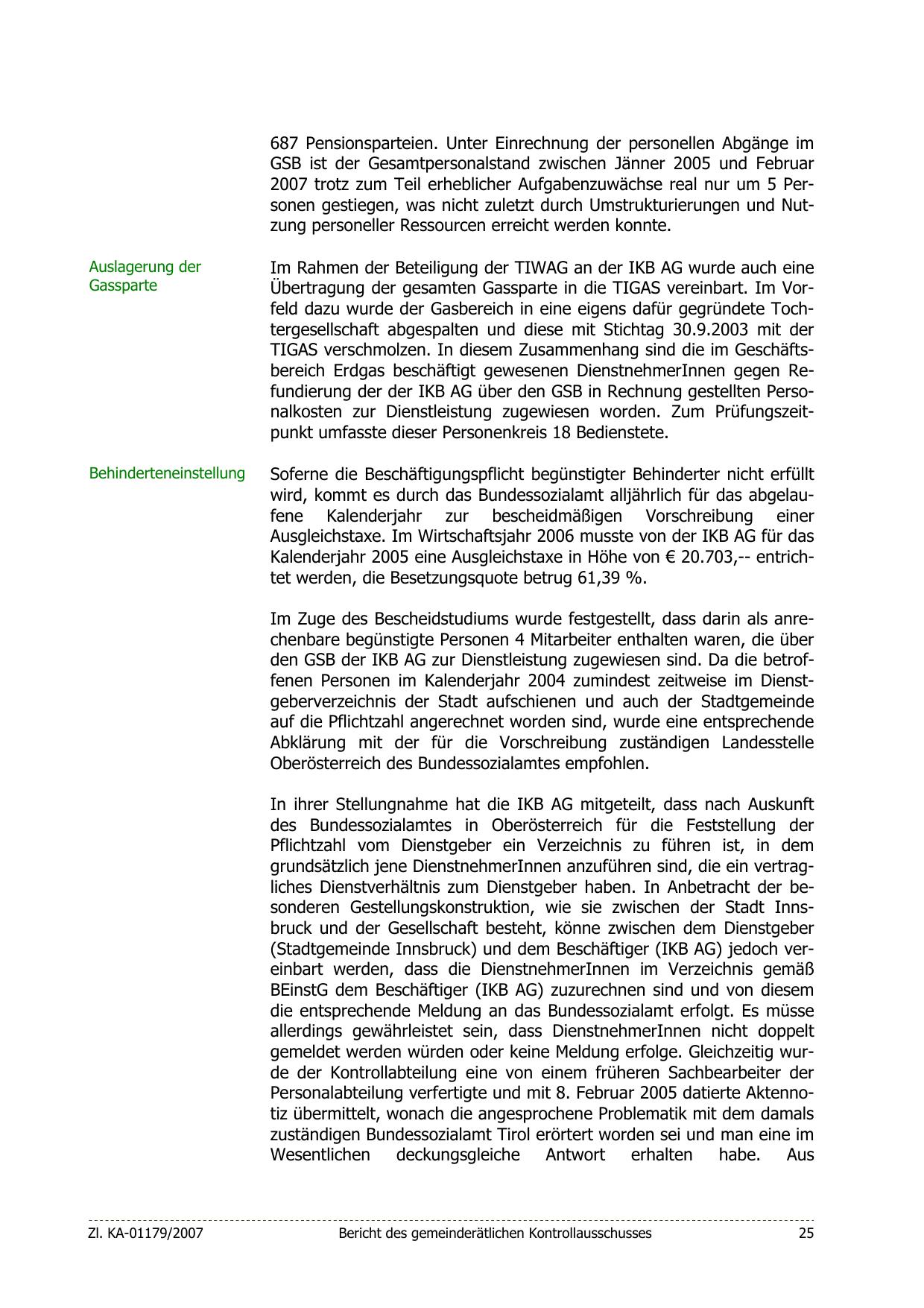 TIGAS verschmolzen. In diesem Zusammenhang sind die im Geschäftsbereich Erdgas beschäftigt gewesenen DienstnehmerInnen gegen Refundierung der der IKB AG über den GSB in Rechnung gestellten Personalkosten zur Dienstleistung zugewiesen worden. Zum Prüfungszeitpunkt umfasste dieser Personenkreis 18 Bedienstete.