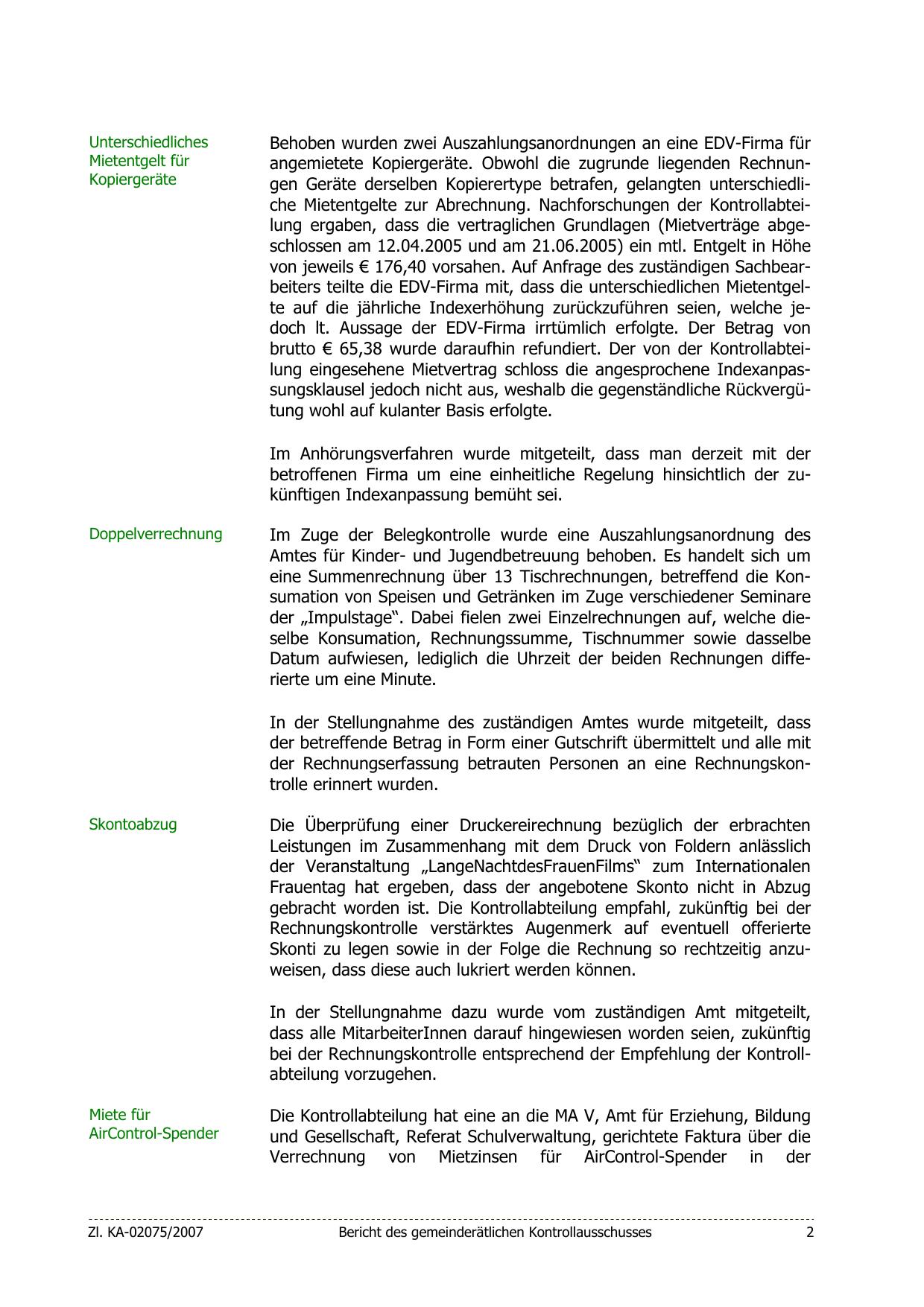 angemietete Kopiergeräte. Obwohl die zugrunde liegenden Rechnungen Geräte derselben Kopierertype betrafen, gelangten unterschiedliche Mietentgelte zur Abrechnung. Nachforschungen der Kontrollabteilung ergaben, dass die vertraglichen Grundlagen (Mietverträge abgeschlossen am 12.04.2005 und am 21.06.2005) ein mtl. Entgelt in Höhe