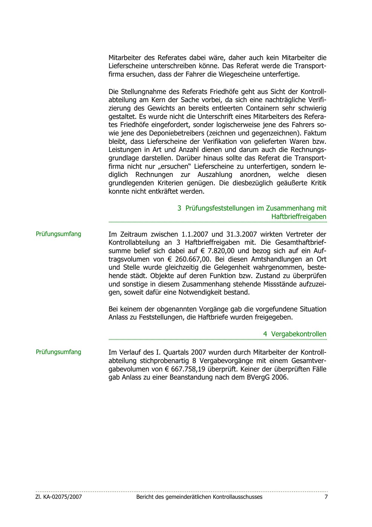 Im Verlauf des I. Quartals 2007 wurden durch Mitarbeiter der Kontrollabteilung stichprobenartig 8 Vergabevorgänge mit einem Gesamtvergabevolumen von € 667.758,19 überprüft. Keiner der überprüften Fälle