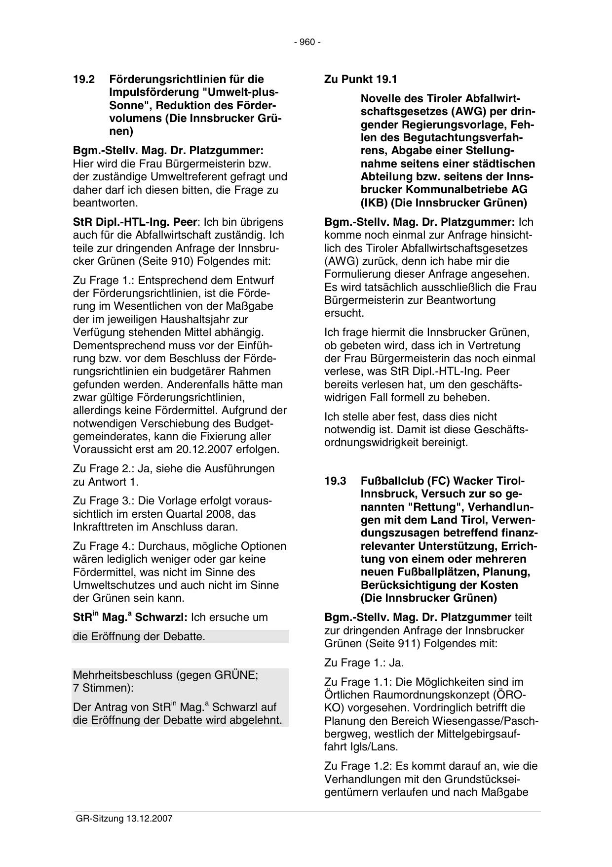 teile zur dringenden Anfrage der Innsbrucker Grünen (Seite 910) Folgendes mit: