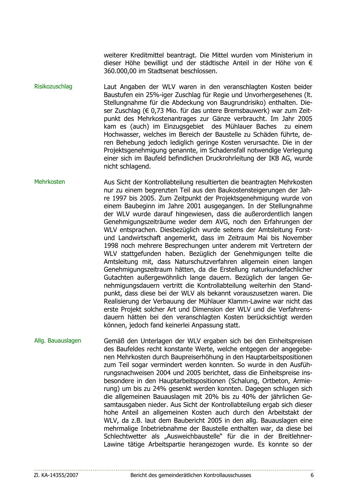 Stellungnahme für die Abdeckung von Baugrundrisiko) enthalten. Dieser Zuschlag (€ 0,73 Mio. für das untere Bremsbauwerk) war zum Zeitpunkt des Mehrkostenantrages zur Gänze verbraucht. Im Jahr 2005