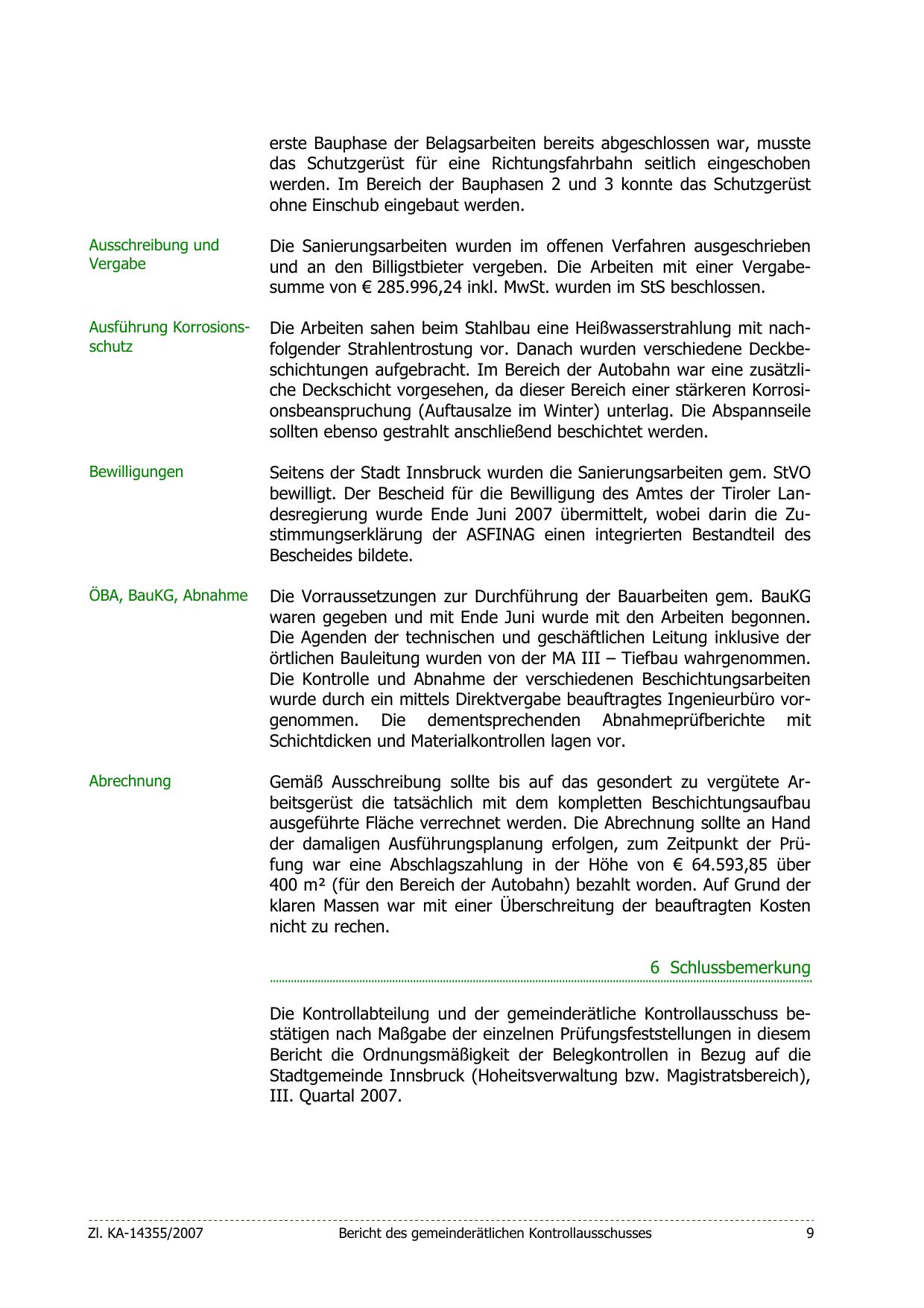 wurde durch ein mittels Direktvergabe beauftragtes Ingenieurbüro vorgenommen. Die dementsprechenden Abnahmeprüfberichte mit