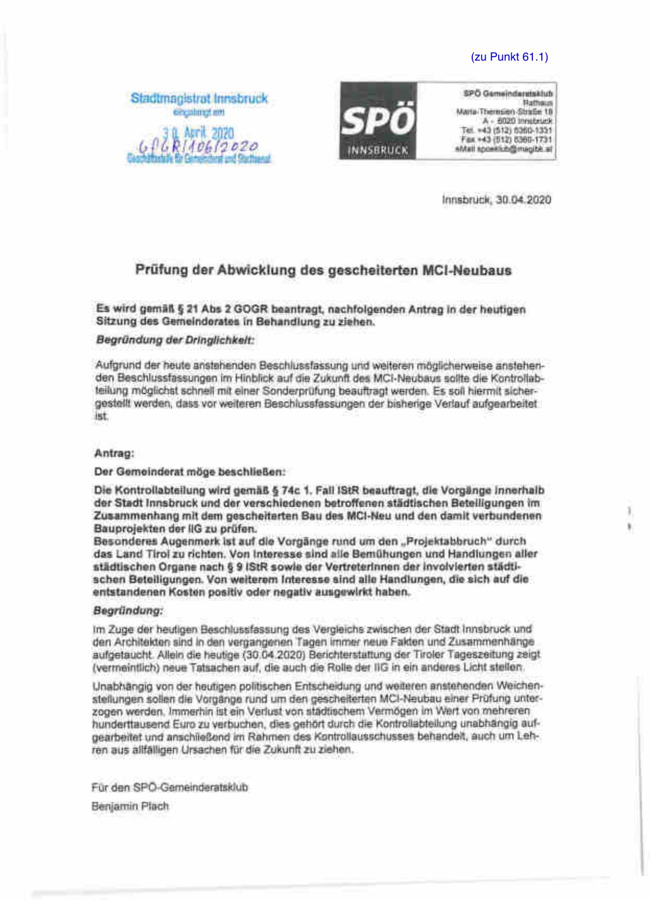 Aufgrund der heute anstehenden Beschlussfassung und weiteren möglicherweise anstehenden Beschlussfassungen im Hinblick auf die Zukunft des MCI-Neubaus sollte die Kontrollabteilung möglichst schnell mit einer Sonderprüfung beauftragt werden. Es soll hiermit sichergestellt werden, dass vor weiteren Beschlussfassungen der bisherige Verlauf aufgearbeitet