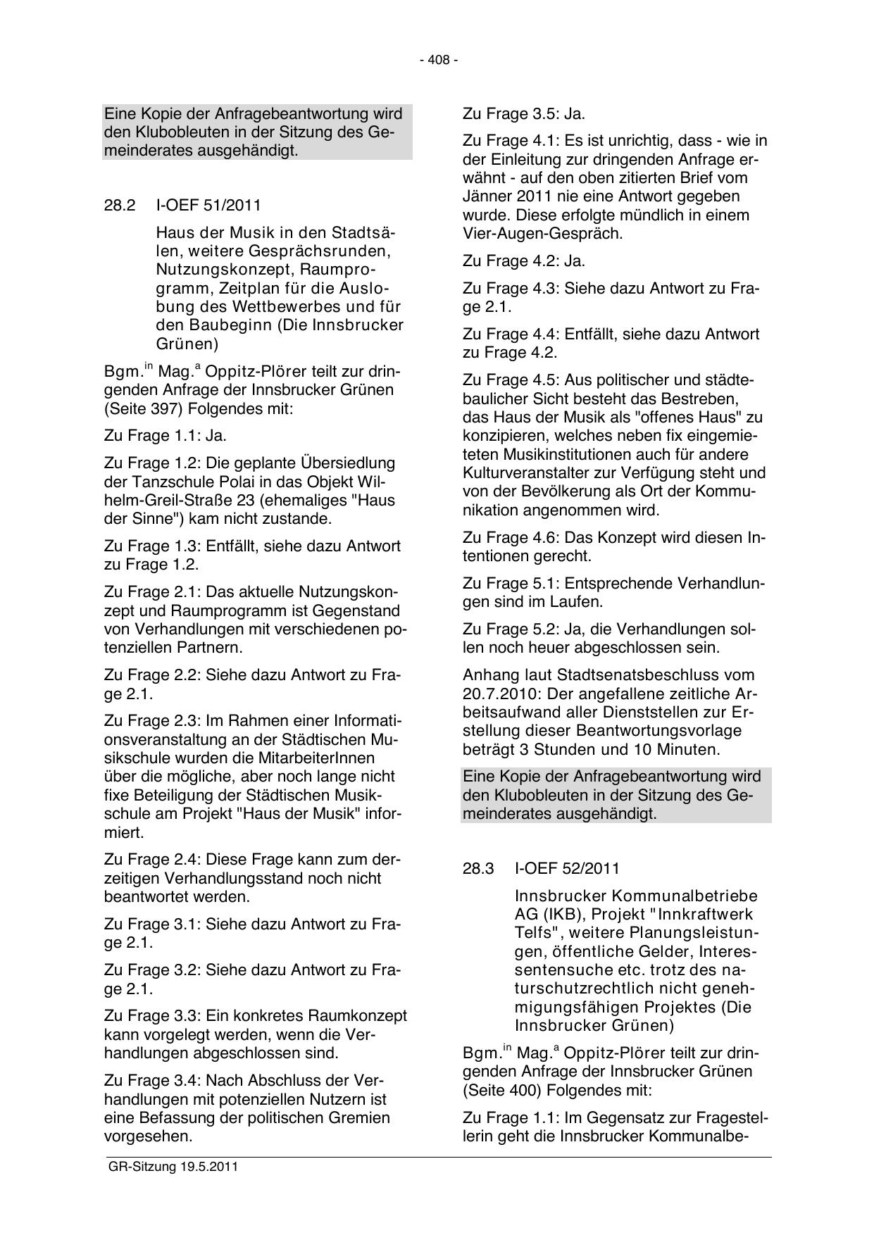 Zu Frage 1.1: Im Gegensatz zur Fragestellerin geht die Innsbrucker Kommunalbe-