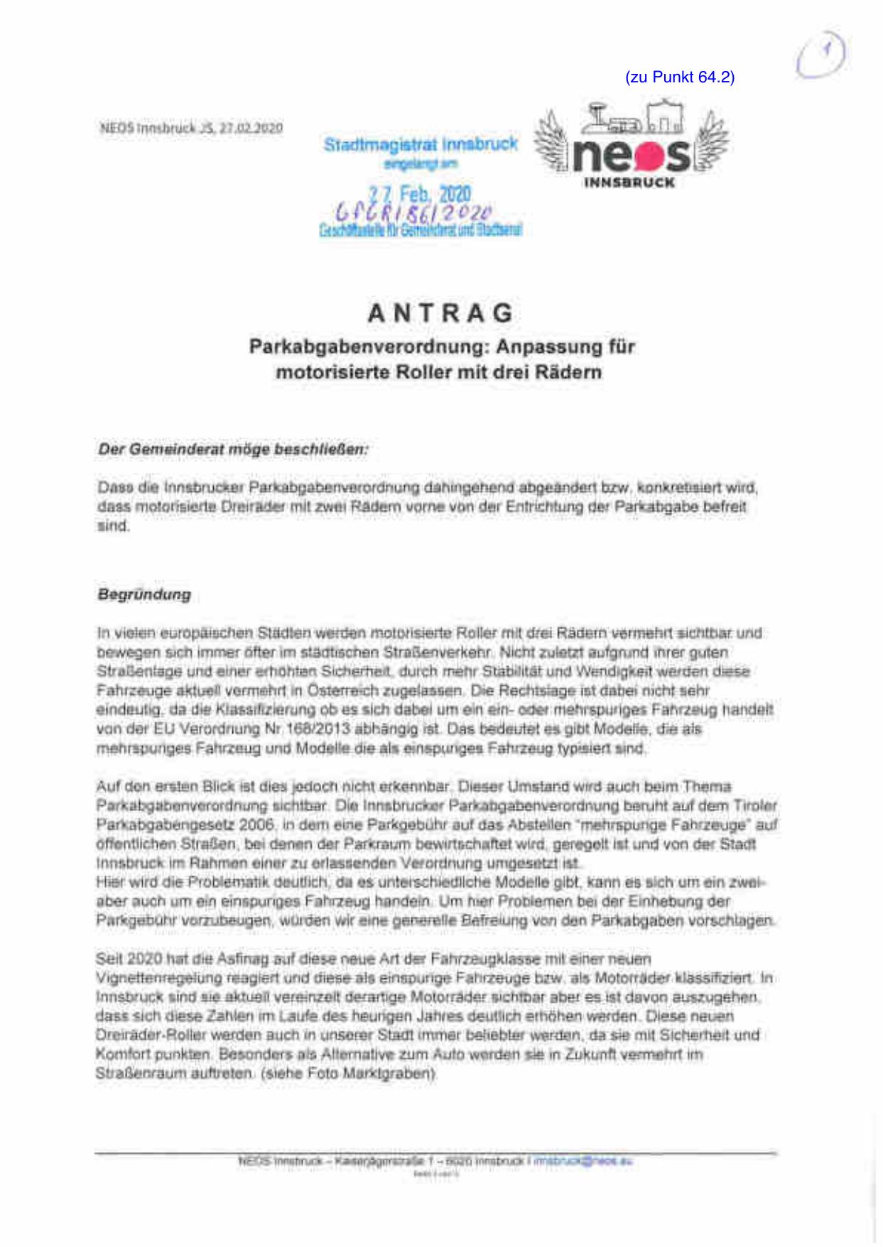 Dass die Innsbrucker Parkabgabenverordnung dahingehend abgeändert bzw. konkretisiert wird