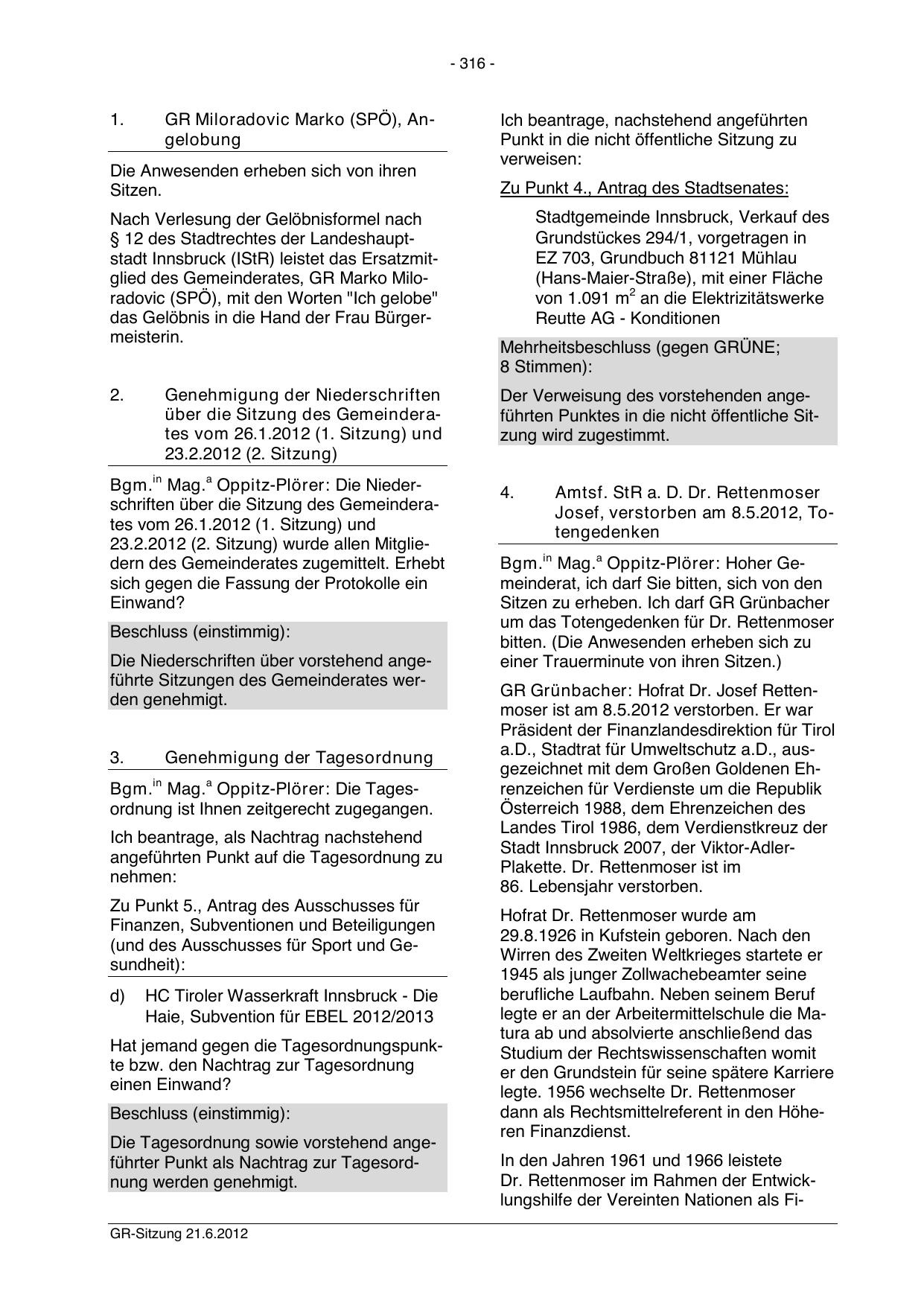 GR Grünbacher: Hofrat Dr. Josef Rettenmoser ist am 8.5.2012 verstorben. Er war
