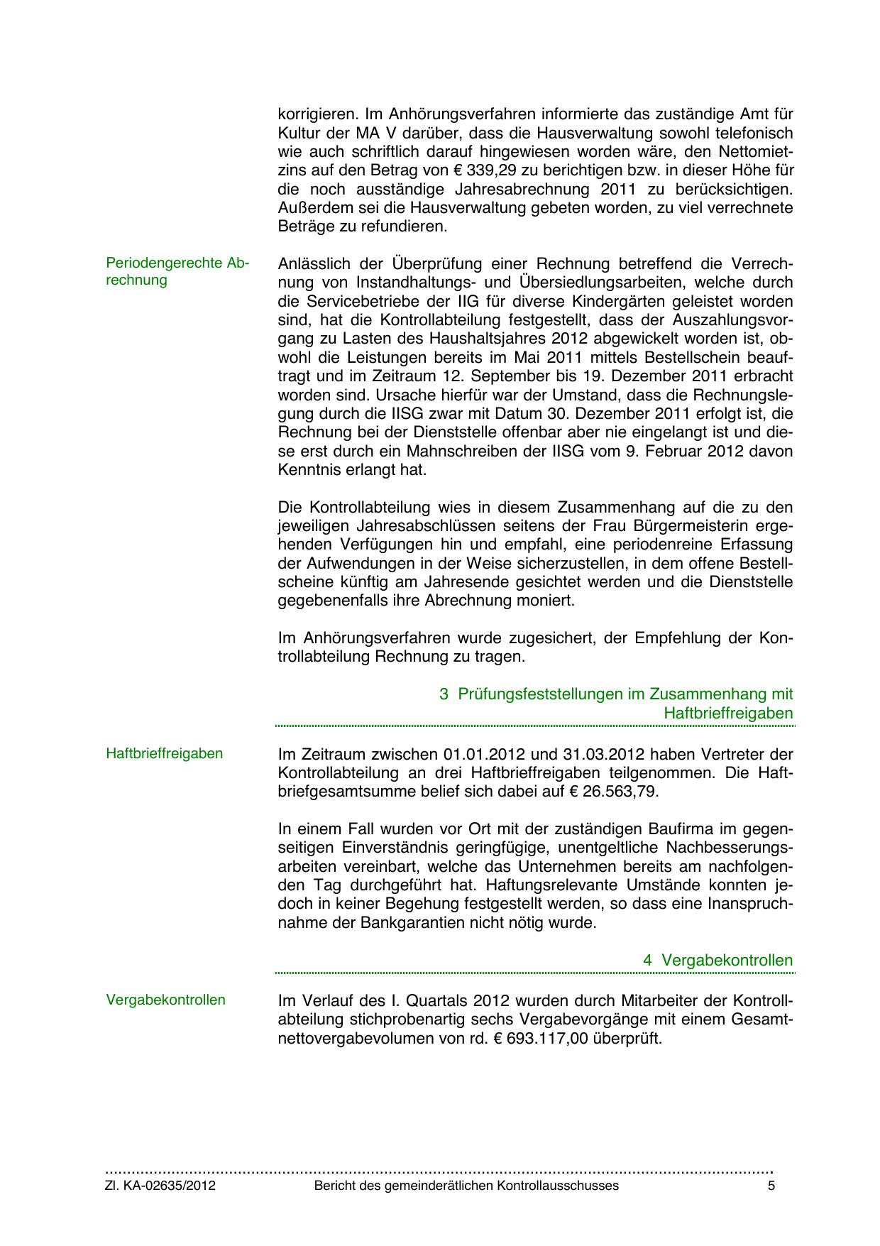 Im Verlauf des I. Quartals 2012 wurden durch Mitarbeiter der Kontrollabteilung stichprobenartig sechs Vergabevorgänge mit einem Gesamtnettovergabevolumen von rd. € 693.117,00 überprüft.