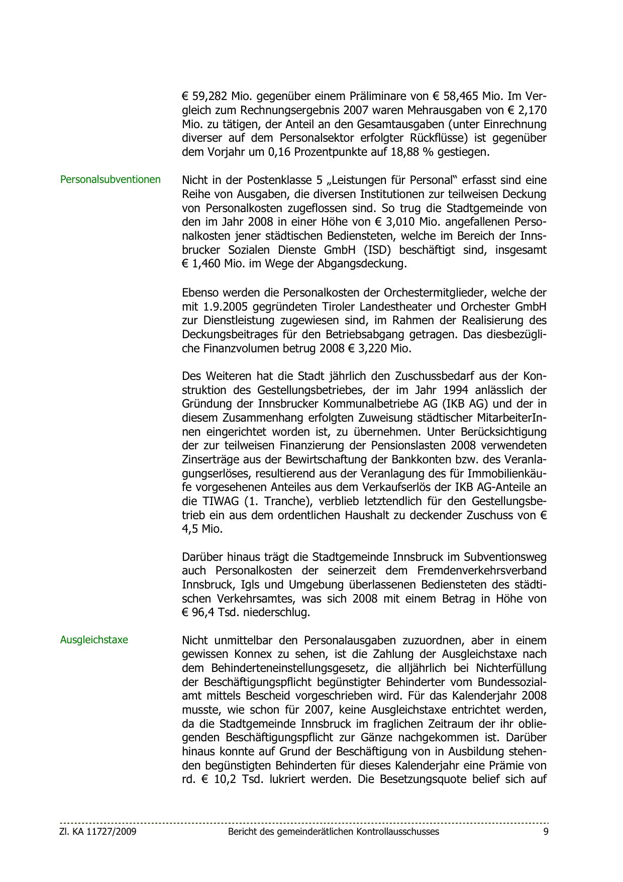 den im Jahr 2008 in einer Höhe von € 3,010 Mio. angefallenen Personalkosten jener städtischen Bediensteten, welche im Bereich der Innsbrucker Sozialen Dienste GmbH (ISD) beschäftigt sind, insgesamt