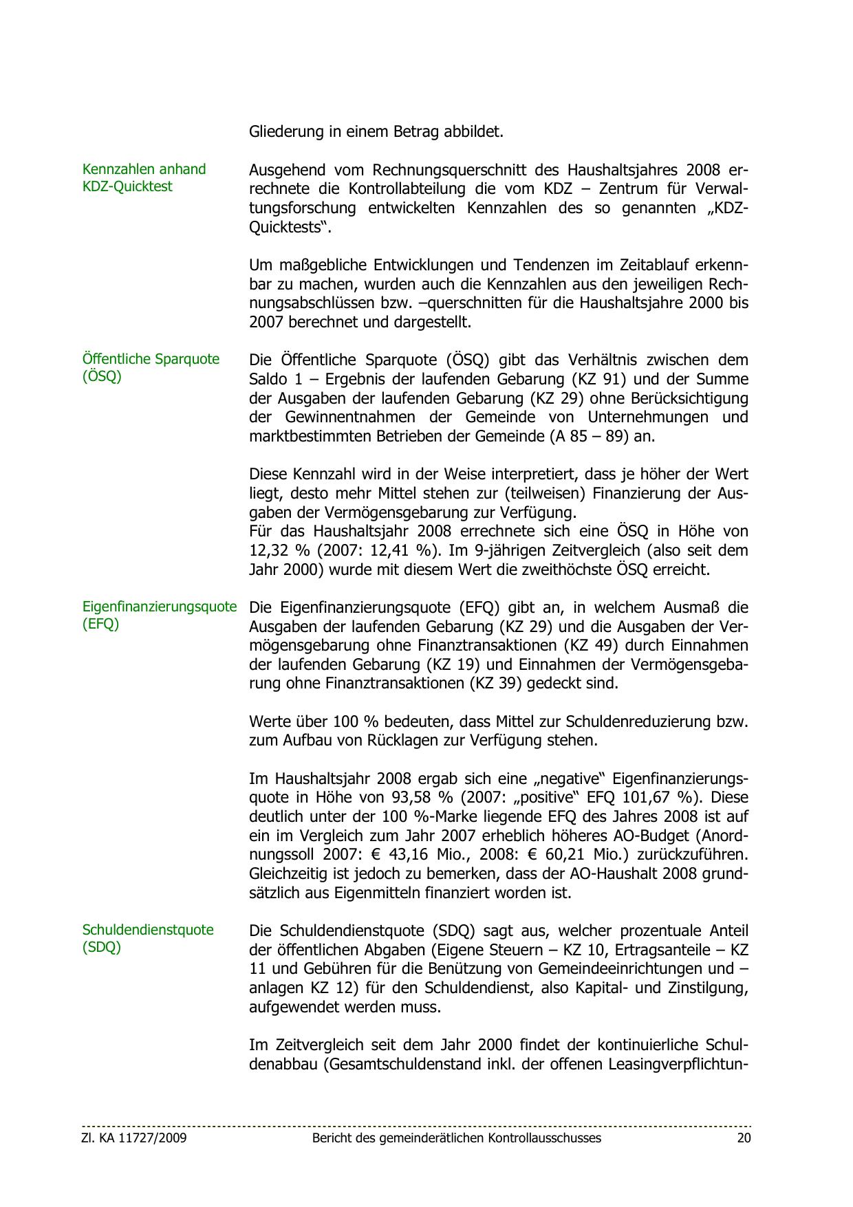Ausgehend vom Rechnungsquerschnitt des Haushaltsjahres 2008 errechnete die Kontrollabteilung die vom KDZ – Zentrum für Verwaltungsforschung entwickelten Kennzahlen des so genannten „KDZQuicktests“.