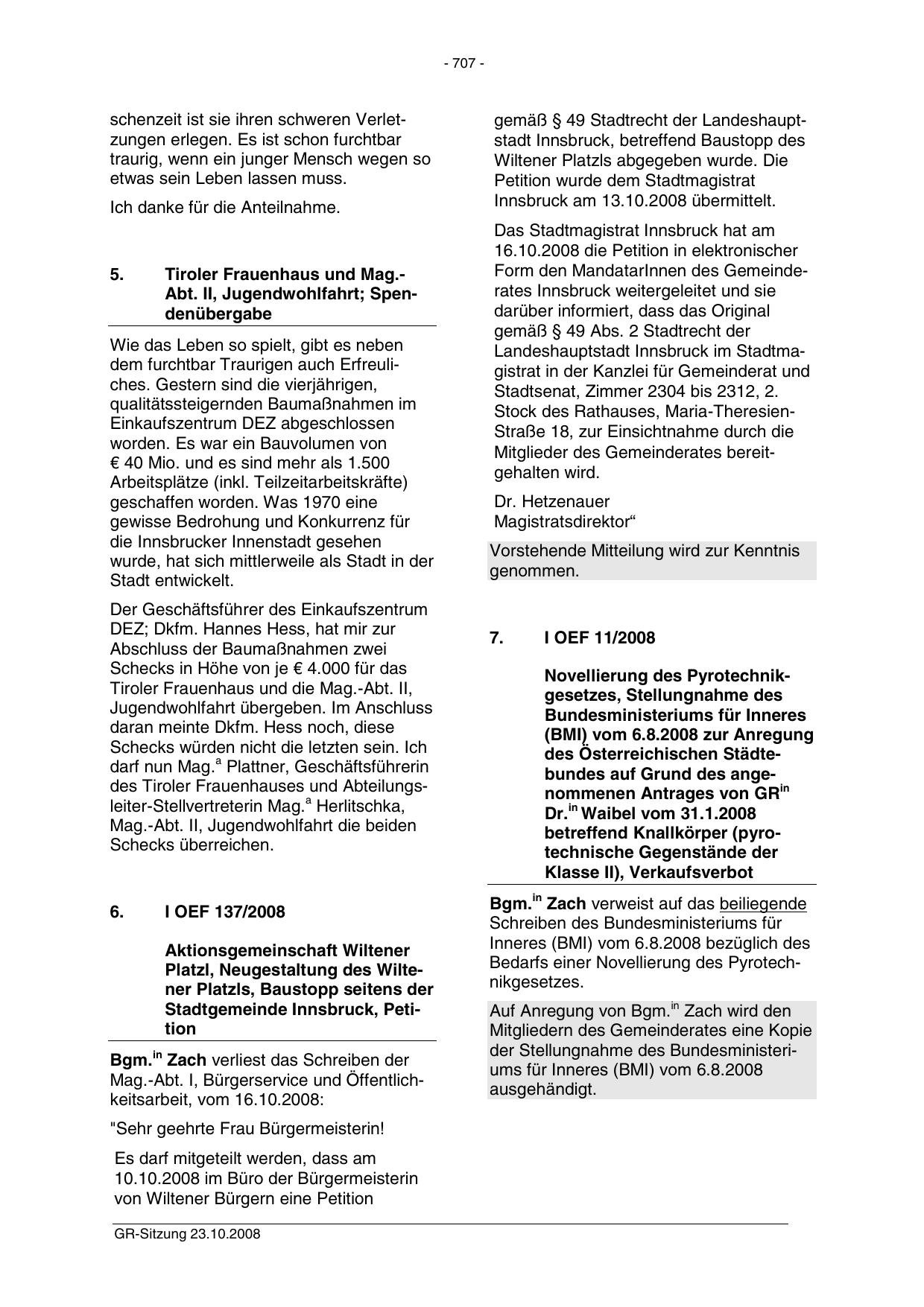 gemäß § 49 Stadtrecht der Landeshauptstadt Innsbruck, betreffend Baustopp des
