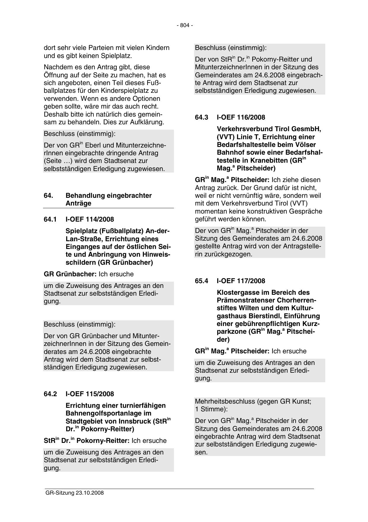 Der von GR Grünbacher und MitunterzeichnerInnen in der Sitzung des Gemeinderates am 24.6.2008 eingebrachte
