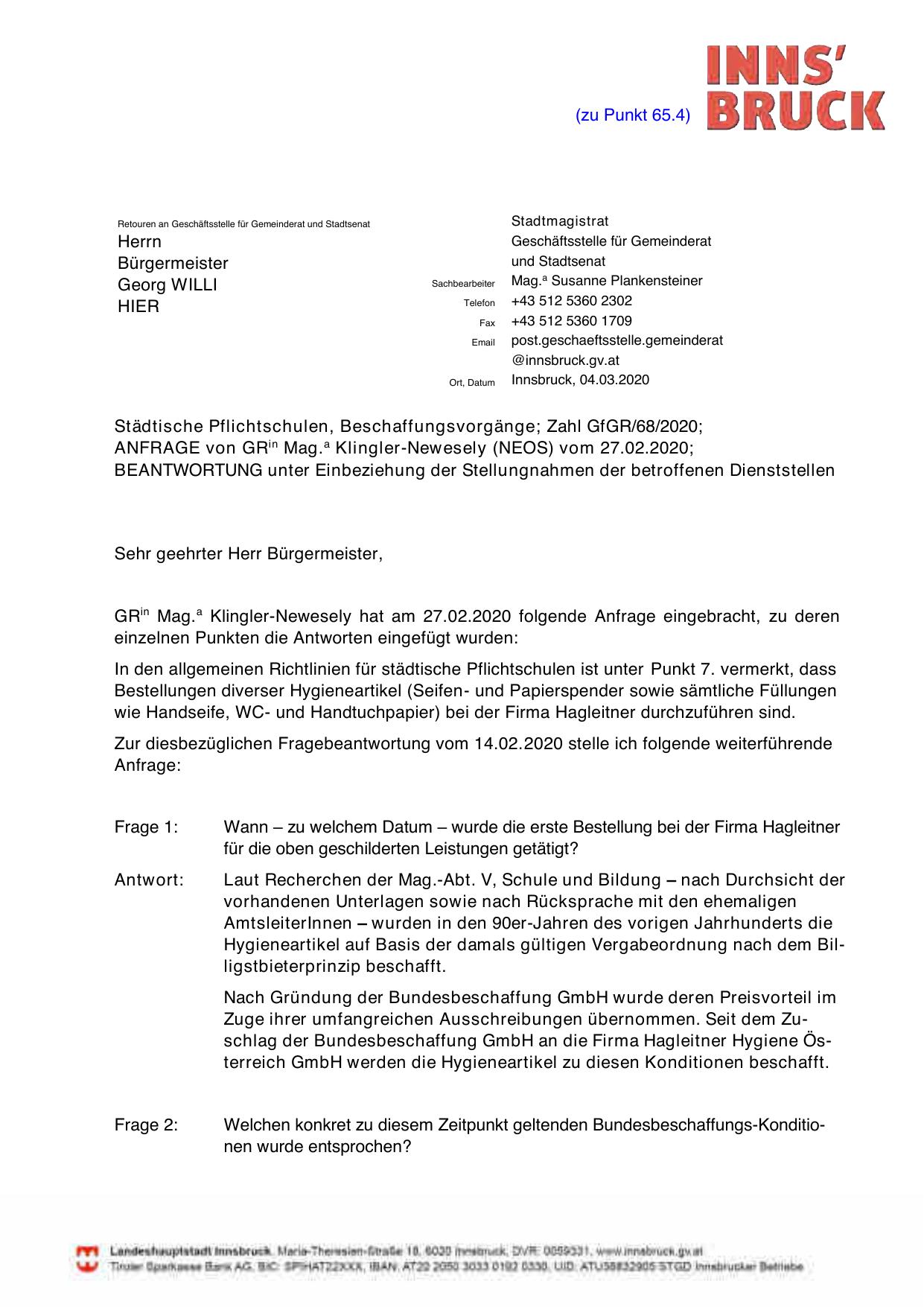 Städtische Pflichtschulen, Beschaffungsvorgänge; Zahl GfGR/68/2020;