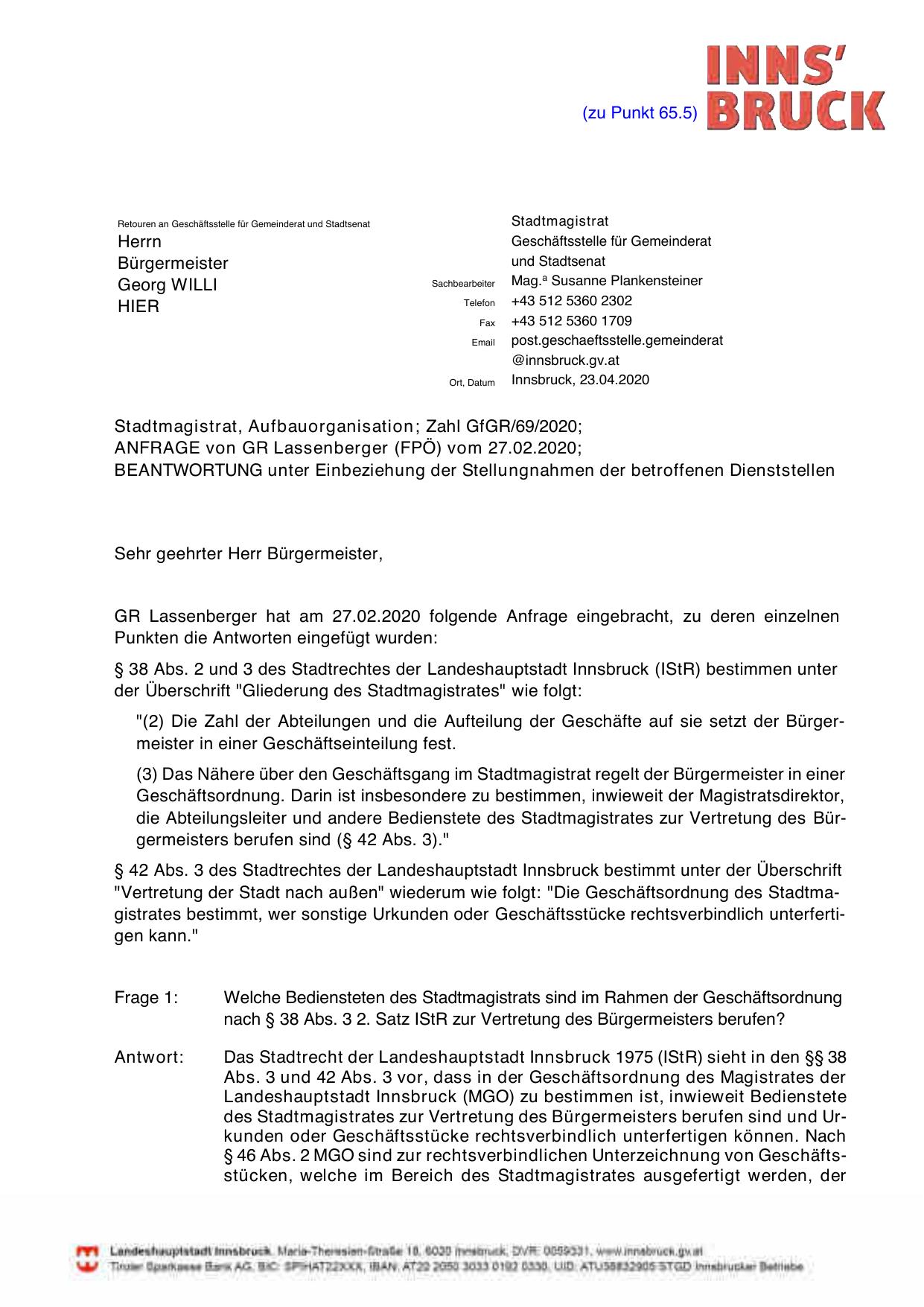 GR Lassenberger hat am 27.02.2020 folgende Anfrage eingebracht, zu deren einzelnen