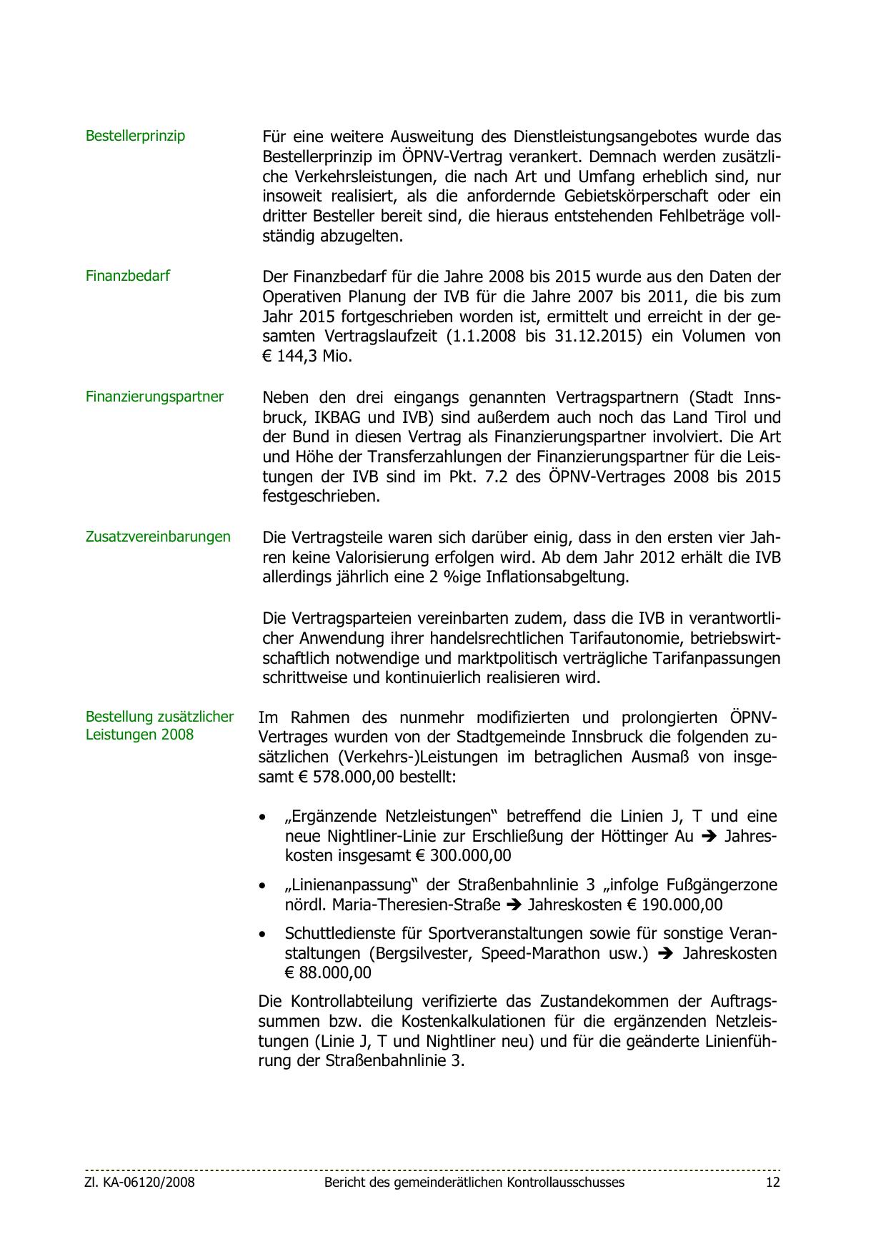 Im Rahmen des nunmehr modifizierten und prolongierten ÖPNVVertrages wurden von der Stadtgemeinde Innsbruck die folgenden zusätzlichen (Verkehrs-)Leistungen im betraglichen Ausmaß von insgesamt € 578.000,00 bestellt: