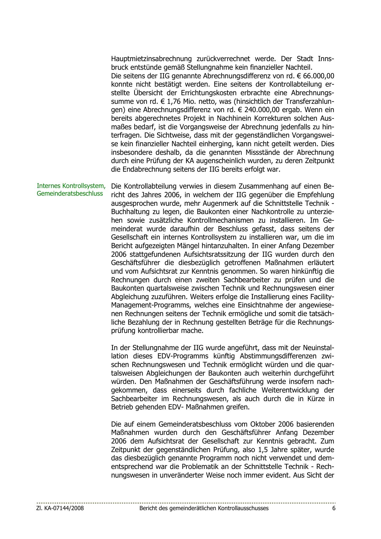 ausgesprochen wurde, mehr Augenmerk auf die Schnittstelle Technik Buchhaltung zu legen, die Baukonten einer Nachkontrolle zu unterziehen sowie zusätzliche Kontrollmechanismen zu installieren. Im Gemeinderat wurde daraufhin der Beschluss gefasst, dass seitens der