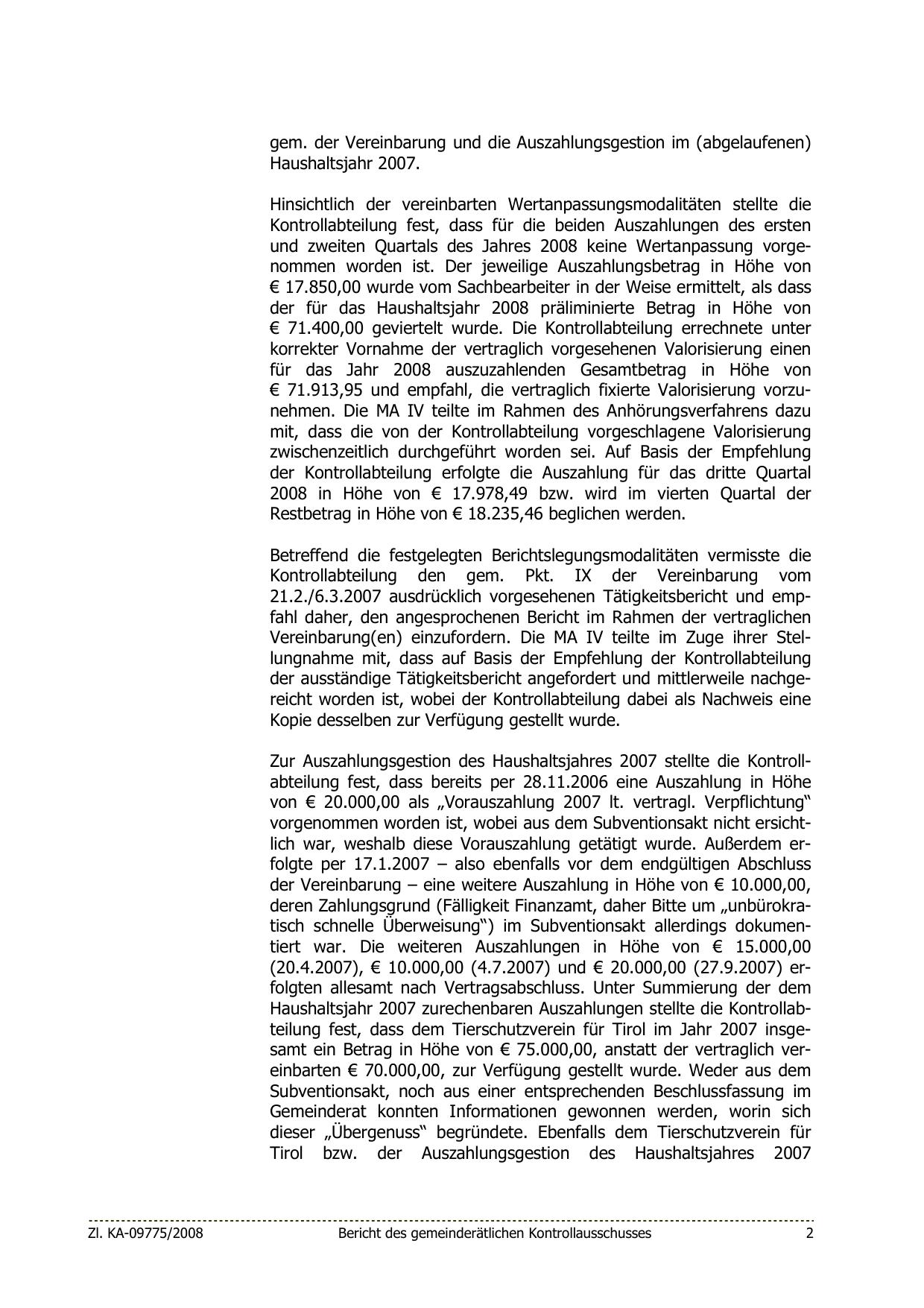 Haushaltsjahr 2007 zurechenbaren Auszahlungen stellte die Kontrollabteilung fest, dass dem Tierschutzverein für Tirol im Jahr 2007 insgesamt ein Betrag in Höhe von € 75.000,00, anstatt der vertraglich vereinbarten € 70.000,00, zur Verfügung gestellt wurde. Weder aus dem