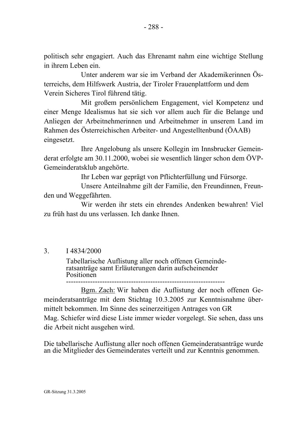 -----------------------------------------------------------------Bgm. Zach: Wir haben die Auflistung der noch offenen Gemeinderatsanträge mit dem Stichtag 10.3.2005 zur Kenntnisnahme übermittelt bekommen. Im Sinne des seinerzeitigen Antrages von GR