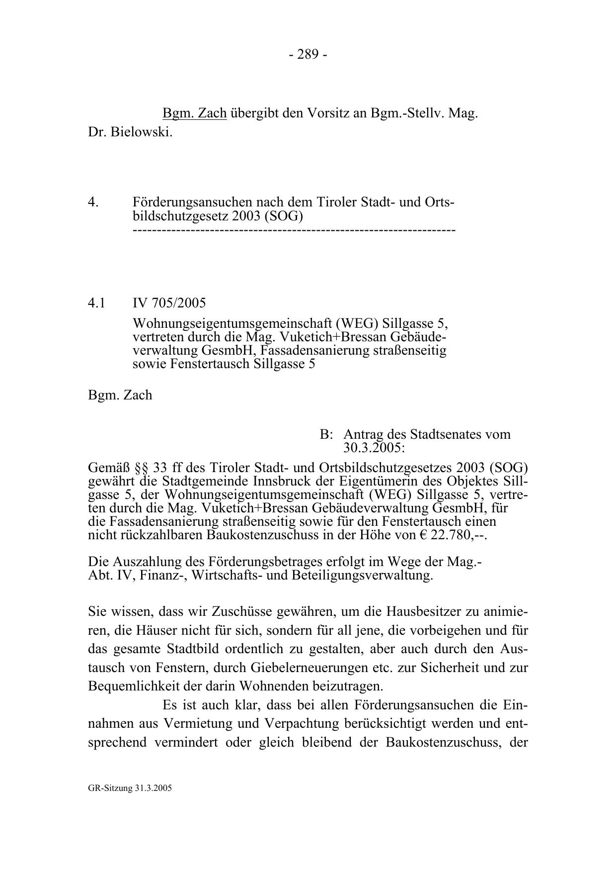 gewährt die Stadtgemeinde Innsbruck der Eigentümerin des Objektes Sillgasse 5, der Wohnungseigentumsgemeinschaft (WEG) Sillgasse 5, vertreten durch die Mag. Vuketich+Bressan Gebäudeverwaltung GesmbH, für