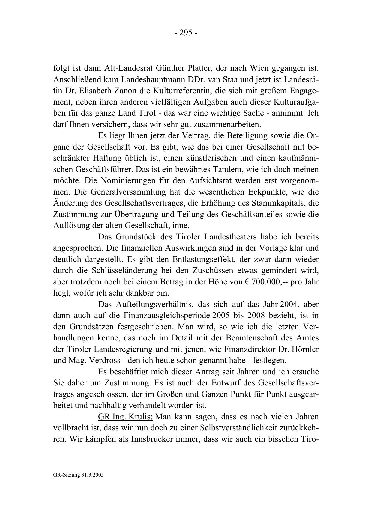 Anschließend kam Landeshauptmann DDr. van Staa und jetzt ist Landesrätin Dr. Elisabeth Zanon die Kulturreferentin, die sich mit großem Engagement, neben ihren anderen vielfältigen Aufgaben auch dieser Kulturaufgaben für das ganze Land Tirol - das war eine wichtige Sache - annimmt. Ich