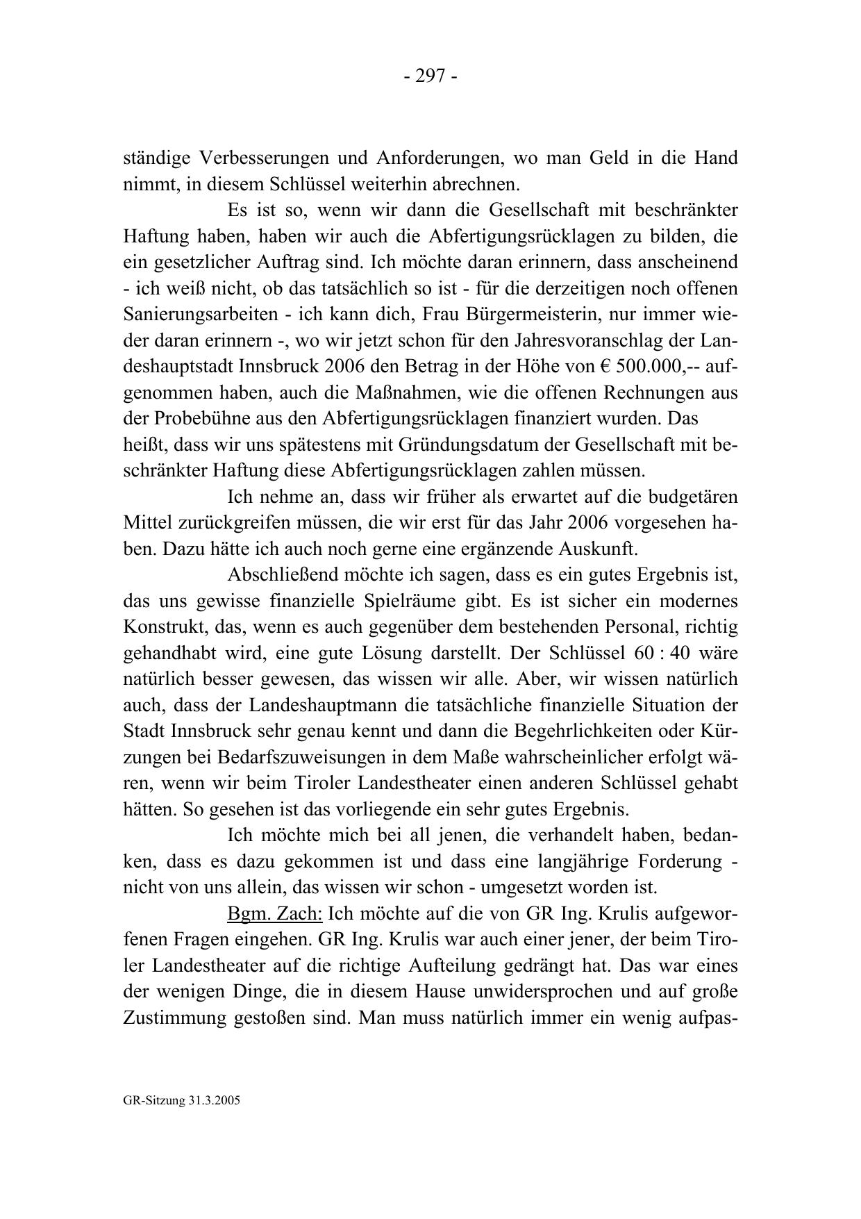 Bgm. Zach: Ich möchte auf die von GR Ing. Krulis aufgeworfenen Fragen eingehen. GR Ing. Krulis war auch einer jener, der beim Tiroler Landestheater auf die richtige Aufteilung gedrängt hat. Das war eines
