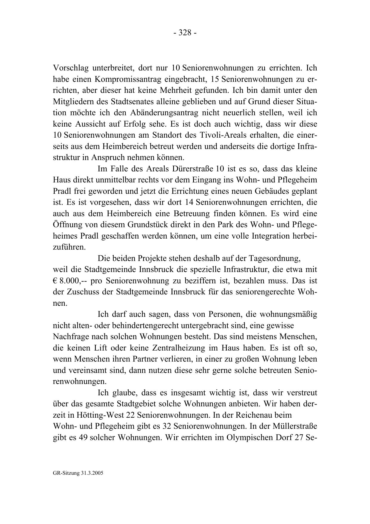 habe einen Kompromissantrag eingebracht, 15 Seniorenwohnungen zu errichten, aber dieser hat keine Mehrheit gefunden. Ich bin damit unter den