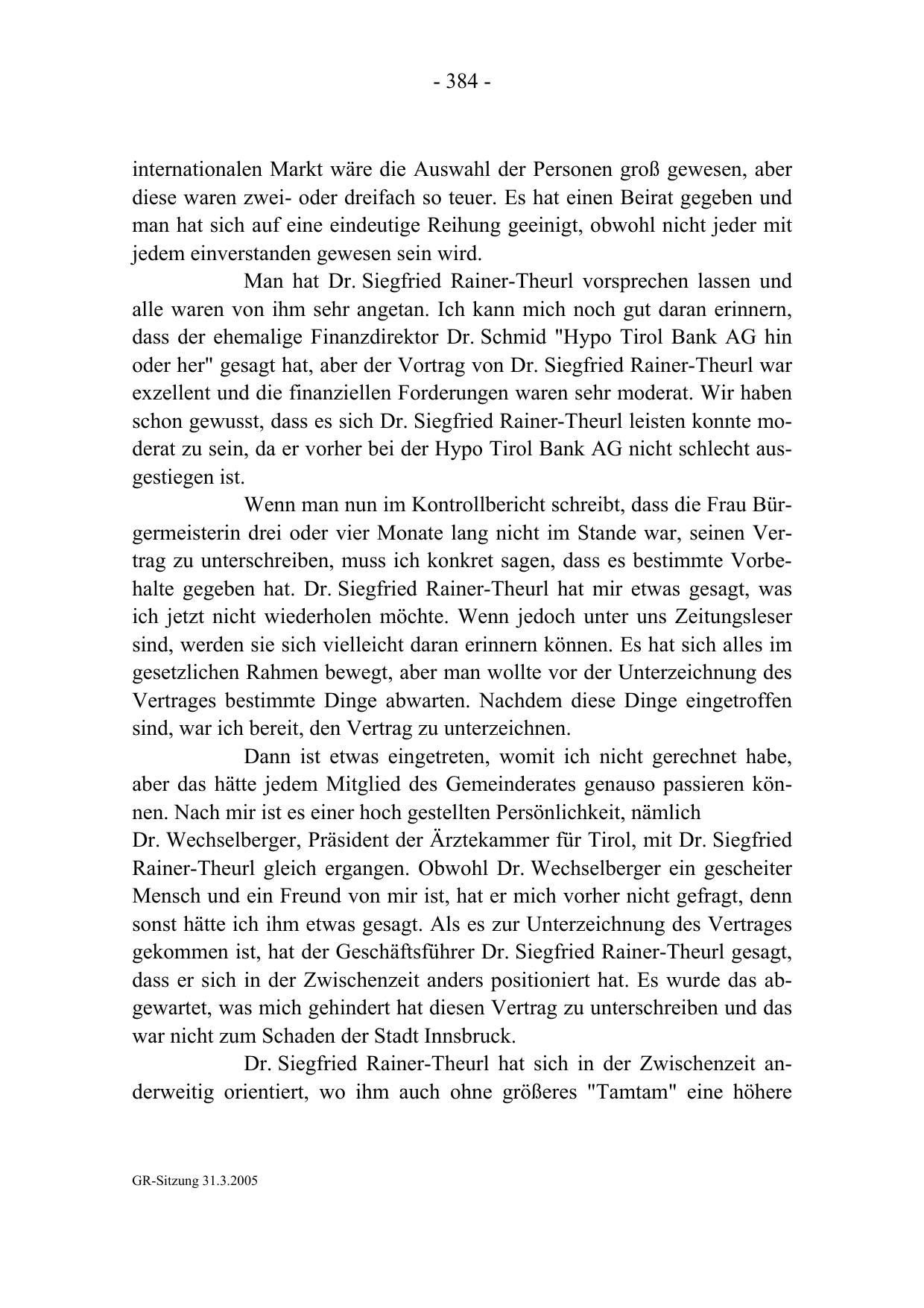 Wenn man nun im Kontrollbericht schreibt, dass die Frau Bürgermeisterin drei oder vier Monate lang nicht im Stande war, seinen Vertrag zu unterschreiben, muss ich konkret sagen, dass es bestimmte Vorbehalte gegeben hat. Dr. Siegfried Rainer-Theurl hat mir etwas gesagt, was