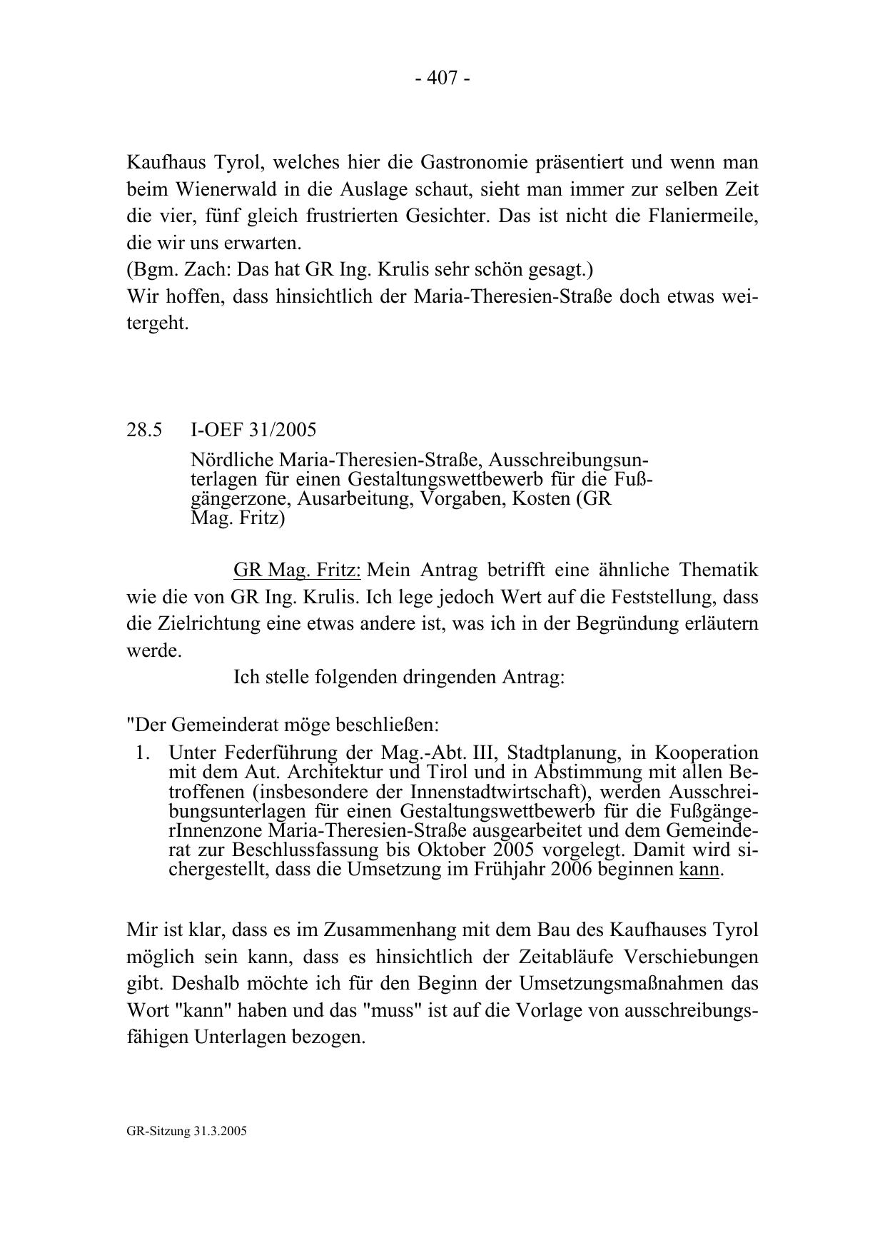 mit dem Aut. Architektur und Tirol und in Abstimmung mit allen Betroffenen (insbesondere der Innenstadtwirtschaft), werden Ausschreibungsunterlagen für einen Gestaltungswettbewerb für die FußgängerInnenzone Maria-Theresien-Straße ausgearbeitet und dem Gemeinderat zur Beschlussfassung bis Oktober 2005 vorgelegt. Damit wird sichergestellt, dass die Umsetzung im Frühjahr 2006 beginnen kann.