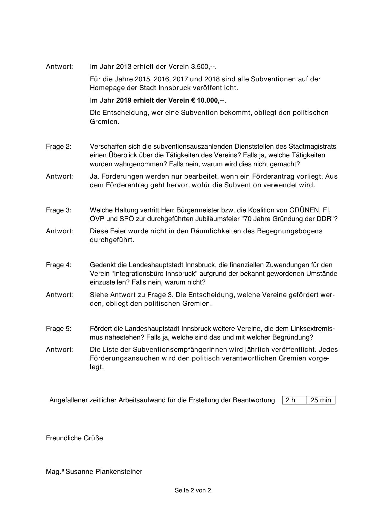 Angefallener zeitlicher Arbeitsaufwand für die Erstellung der Beantwortung