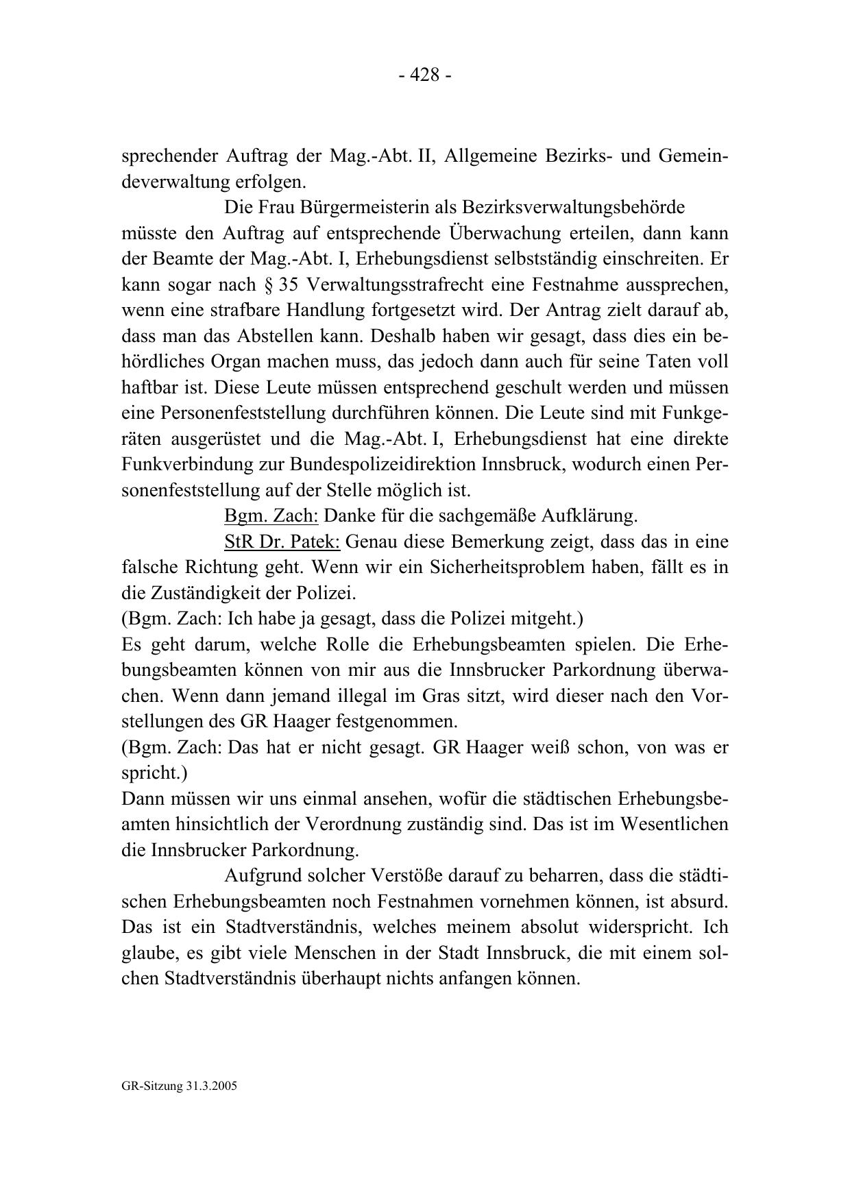 Es geht darum, welche Rolle die Erhebungsbeamten spielen. Die Erhebungsbeamten können von mir aus die Innsbrucker Parkordnung überwachen. Wenn dann jemand illegal im Gras sitzt, wird dieser nach den Vorstellungen des GR Haager festgenommen.