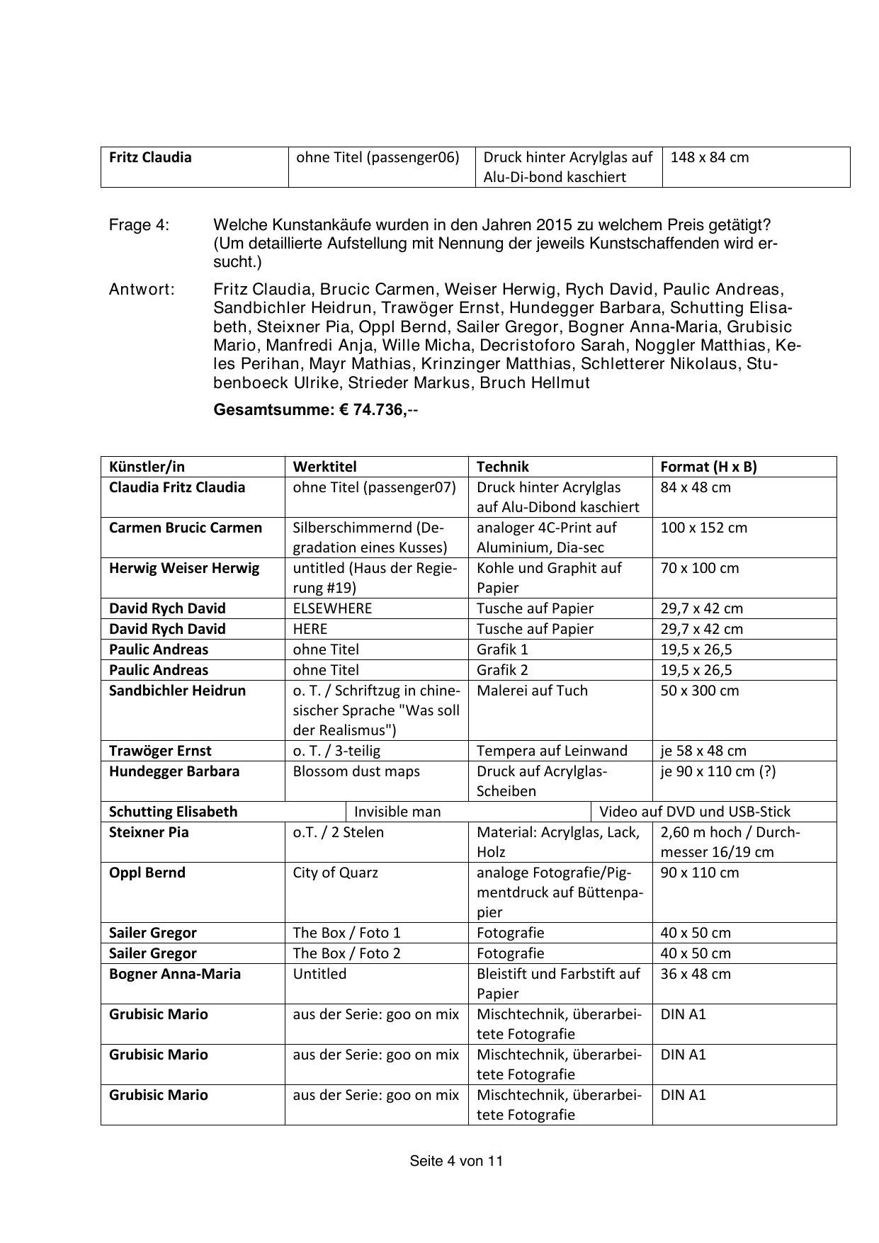 (Um detaillierte Aufstellung mit Nennung der jeweils Kunstschaffenden wird ersucht.)
