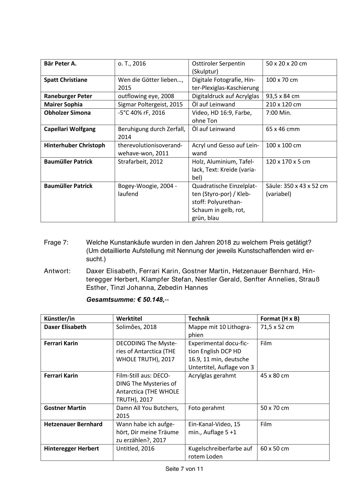 (Um detaillierte Aufstellung mit Nennung der jeweils Kunstschaffenden wird ersucht.)