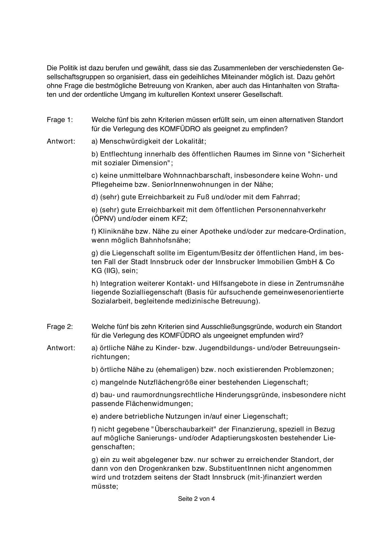 g) die Liegenschaft sollte im Eigentum/Besitz der öffentlichen Hand, im besten Fall der Stadt Innsbruck oder der Innsbrucker Immobilien GmbH & Co