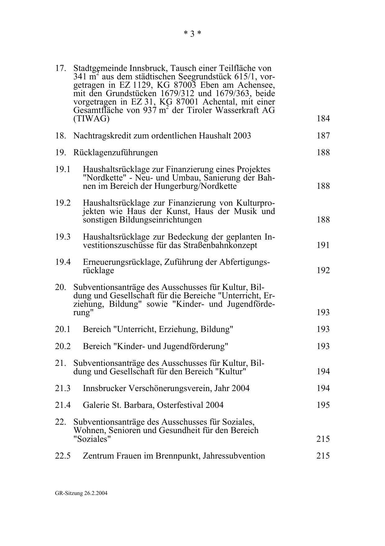 18. Nachtragskredit zum ordentlichen Haushalt 2003