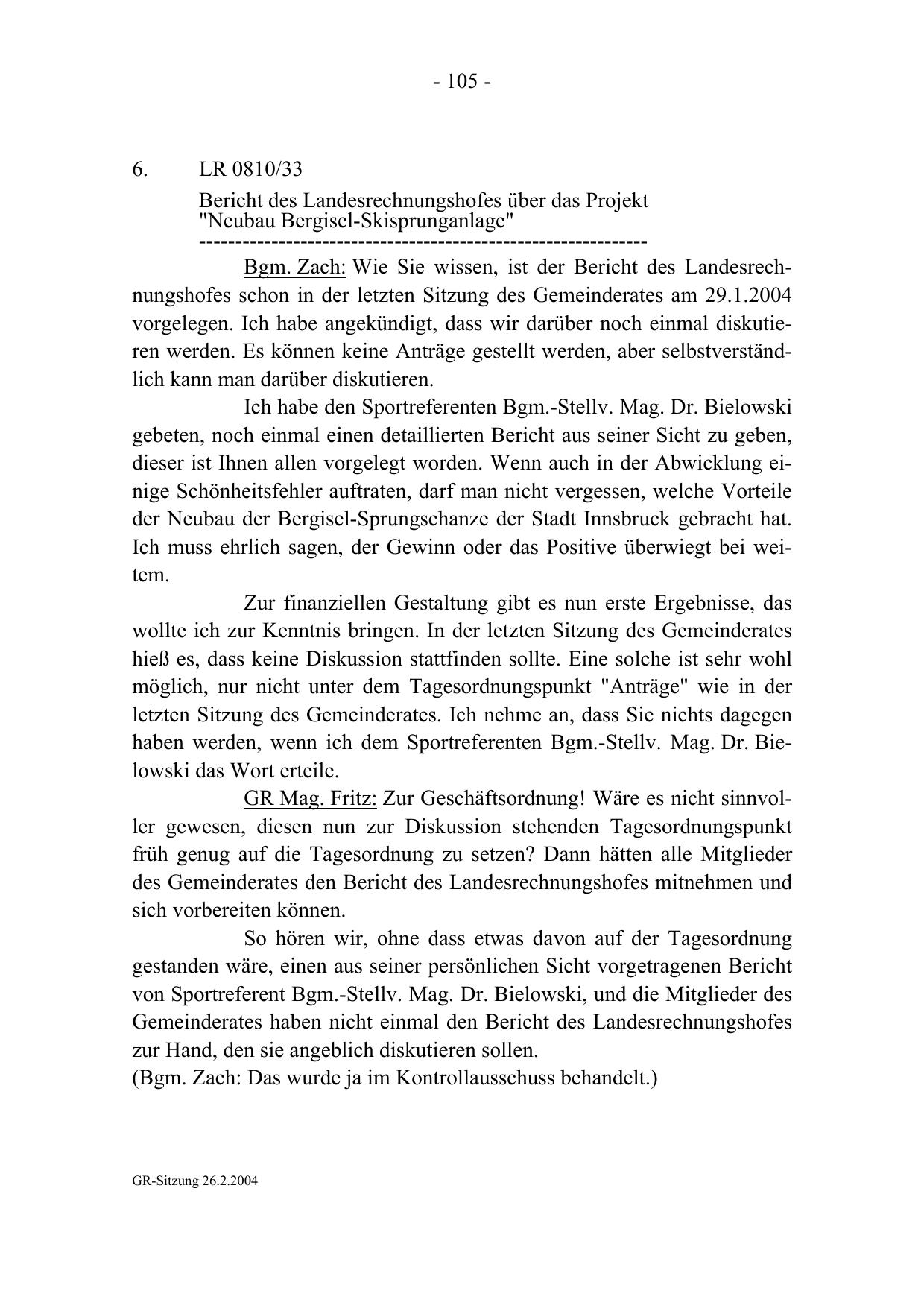 -------------------------------------------------------------Bgm. Zach: Wie Sie wissen, ist der Bericht des Landesrechnungshofes schon in der letzten Sitzung des Gemeinderates am 29.1.2004