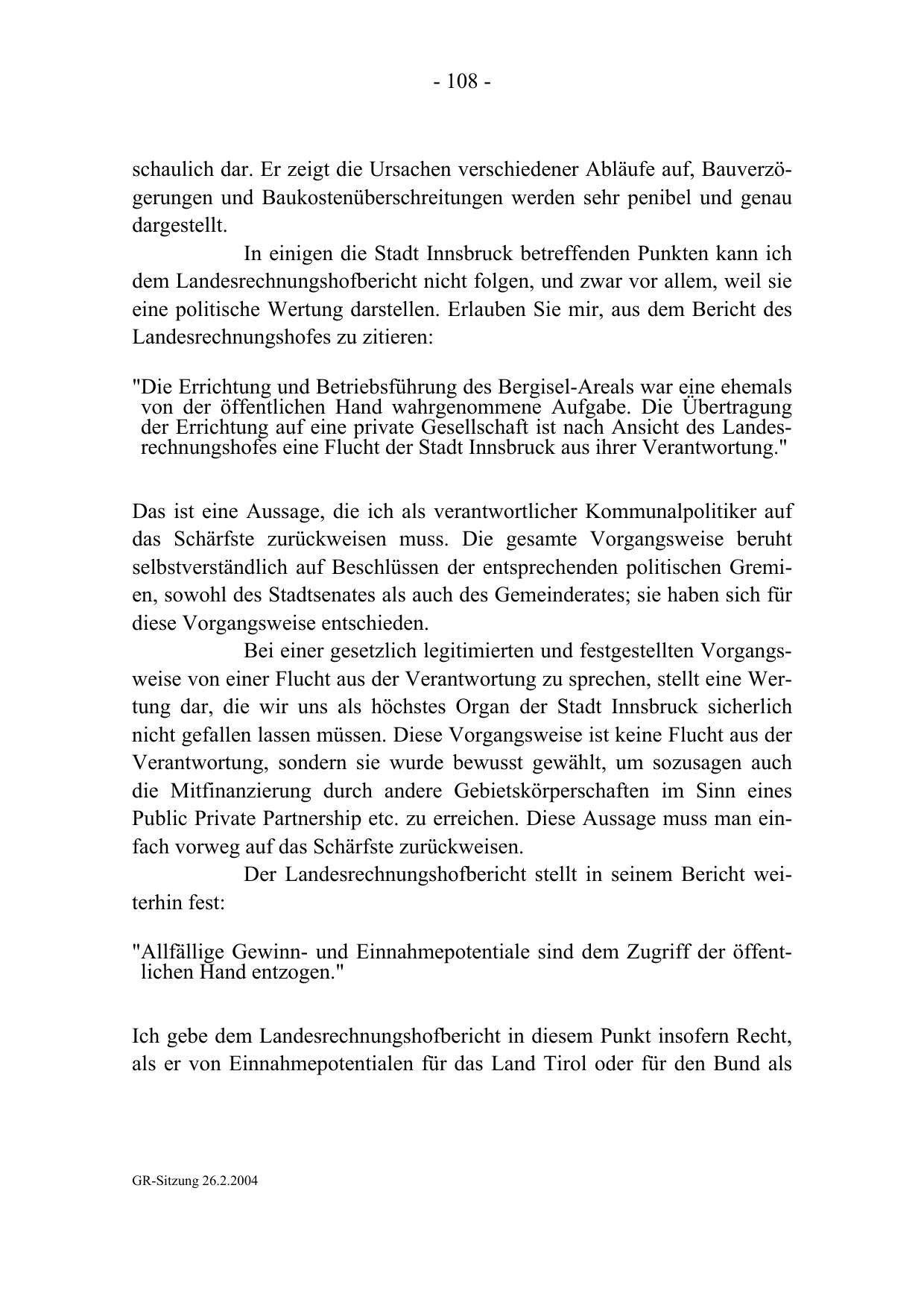 Bei einer gesetzlich legitimierten und festgestellten Vorgangsweise von einer Flucht aus der Verantwortung zu sprechen, stellt eine Wertung dar, die wir uns als höchstes Organ der Stadt Innsbruck sicherlich