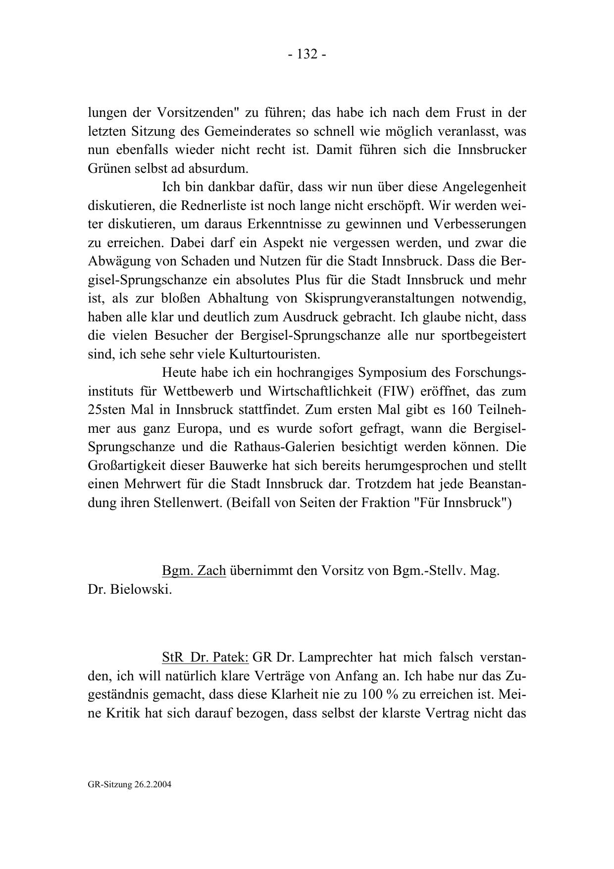 StR Dr. Patek: GR Dr. Lamprechter hat mich falsch verstanden, ich will natürlich klare Verträge von Anfang an. Ich habe nur das Zugeständnis gemacht, dass diese Klarheit nie zu 100 % zu erreichen ist. Meine Kritik hat sich darauf bezogen, dass selbst der klarste Vertrag nicht das
