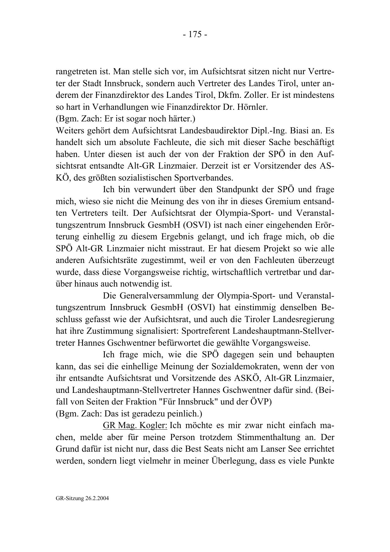 mich, wieso sie nicht die Meinung des von ihr in dieses Gremium entsandten Vertreters teilt. Der Aufsichtsrat der Olympia-Sport- und Veranstaltungszentrum Innsbruck GesmbH (OSVI) ist nach einer eingehenden Erörterung einhellig zu diesem Ergebnis gelangt, und ich frage mich, ob die