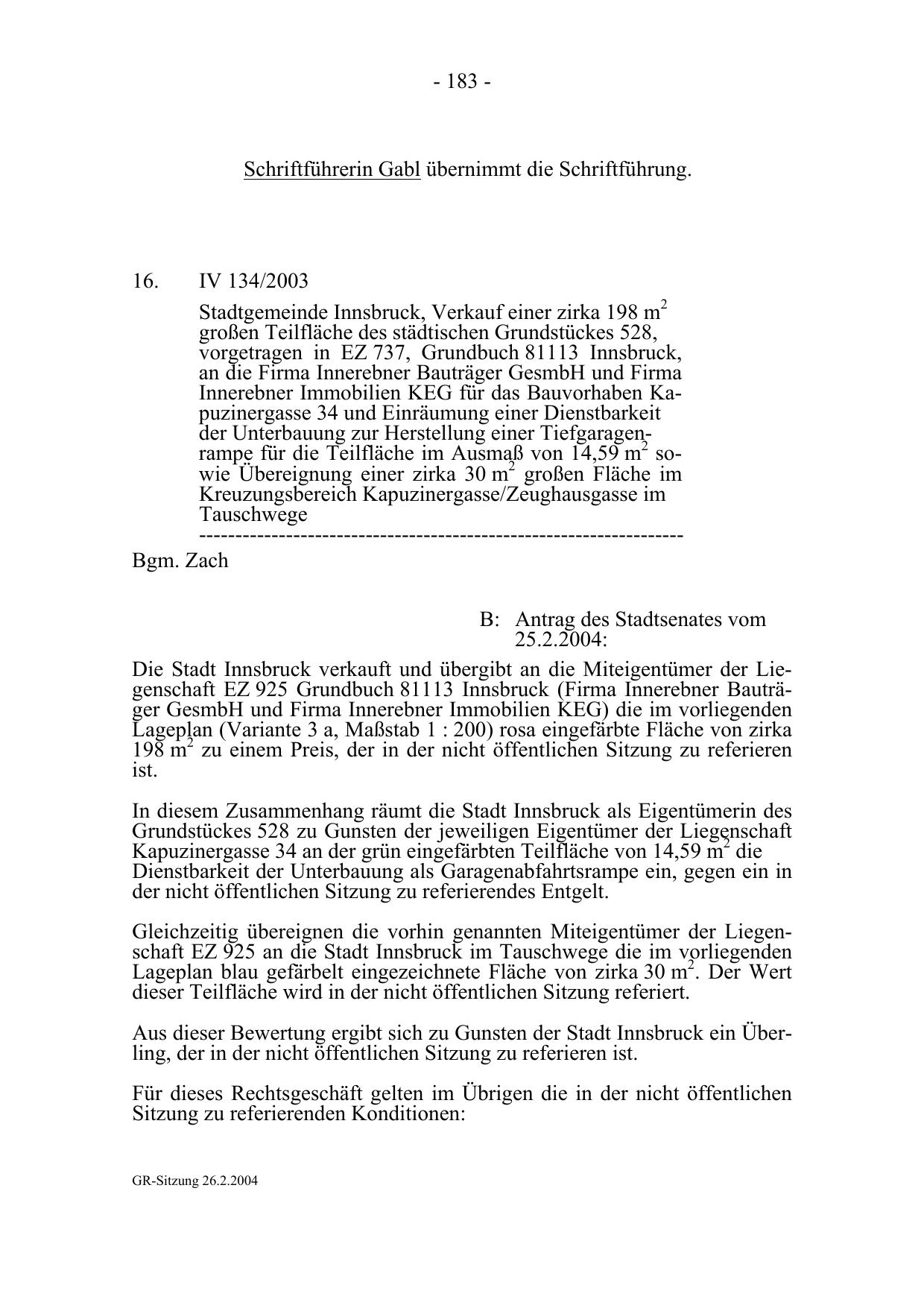 Stadtgemeinde Innsbruck, Verkauf einer zirka 198 m2