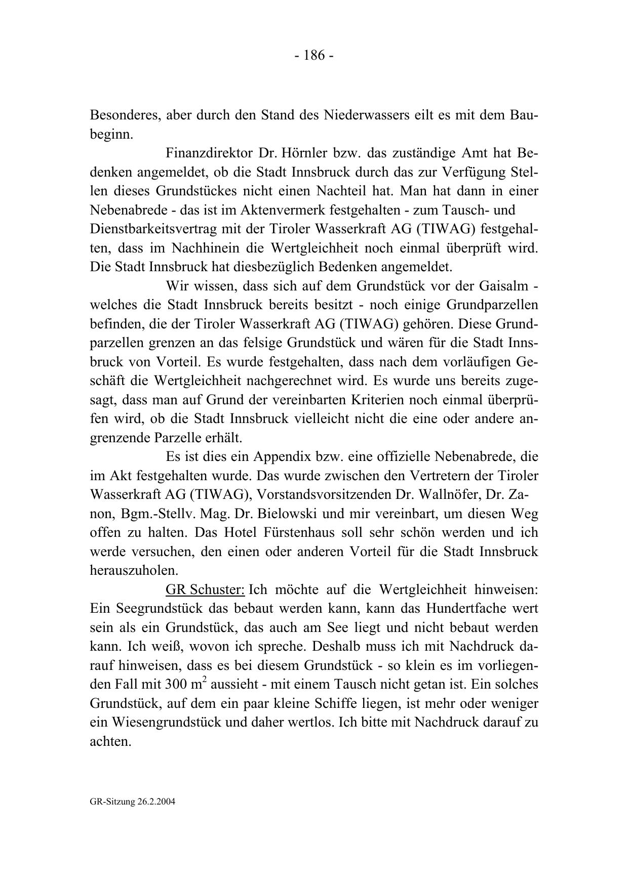 befinden, die der Tiroler Wasserkraft AG (TIWAG) gehören. Diese Grundparzellen grenzen an das felsige Grundstück und wären für die Stadt Innsbruck von Vorteil. Es wurde festgehalten, dass nach dem vorläufigen Geschäft die Wertgleichheit nachgerechnet wird. Es wurde uns bereits zugesagt, dass man auf Grund der vereinbarten Kriterien noch einmal überprüfen wird, ob die Stadt Innsbruck vielleicht nicht die eine oder andere angrenzende Parzelle erhält.