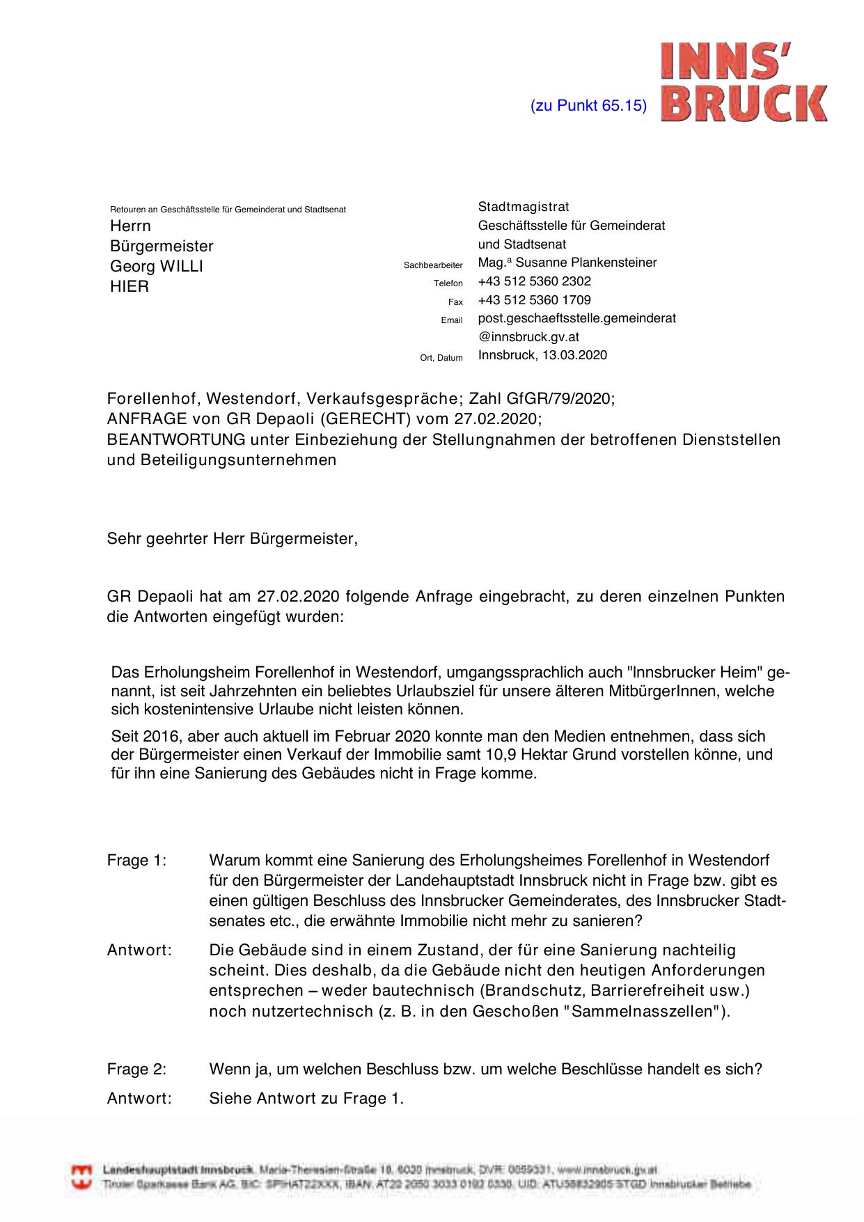 GR Depaoli hat am 27.02.2020 folgende Anfrage eingebracht, zu deren einzelnen Punkten