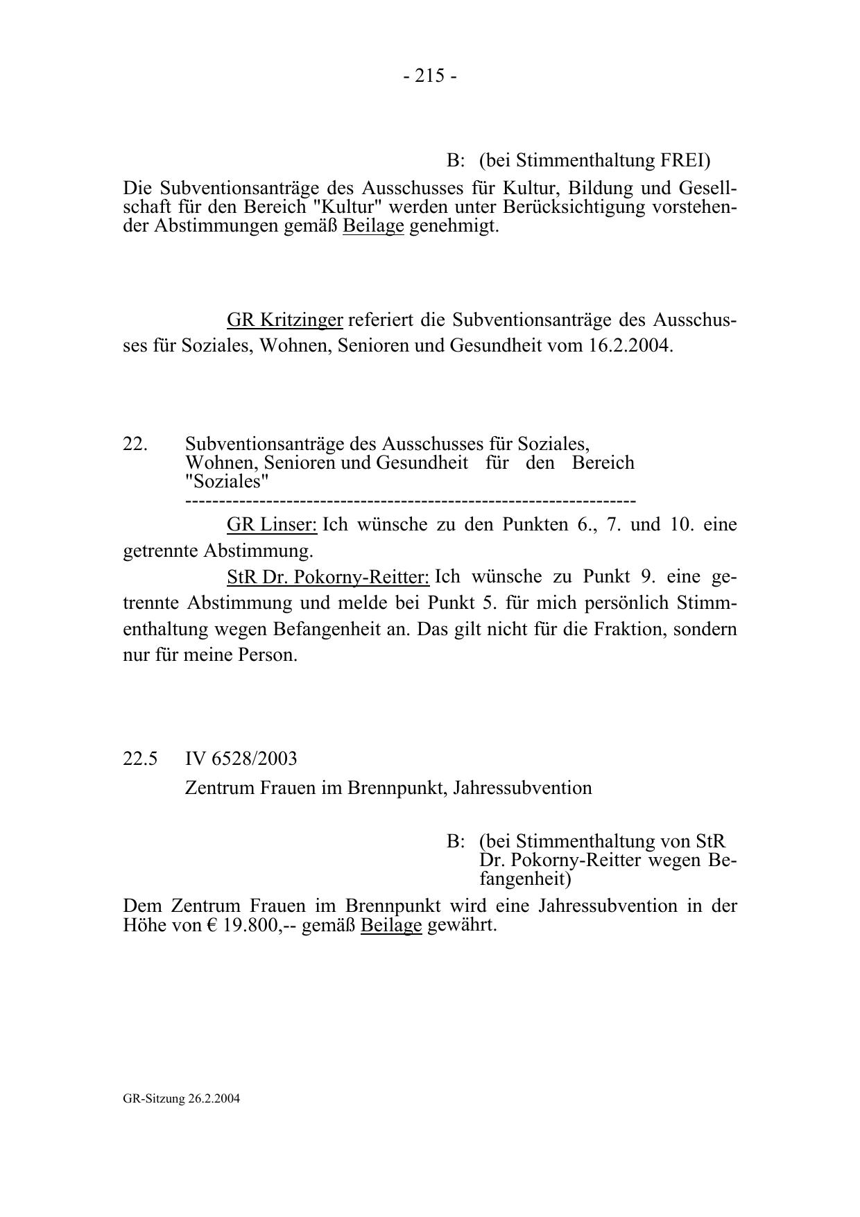 GR Kritzinger referiert die Subventionsanträge des Ausschusses für Soziales, Wohnen, Senioren und Gesundheit vom 16.2.2004.