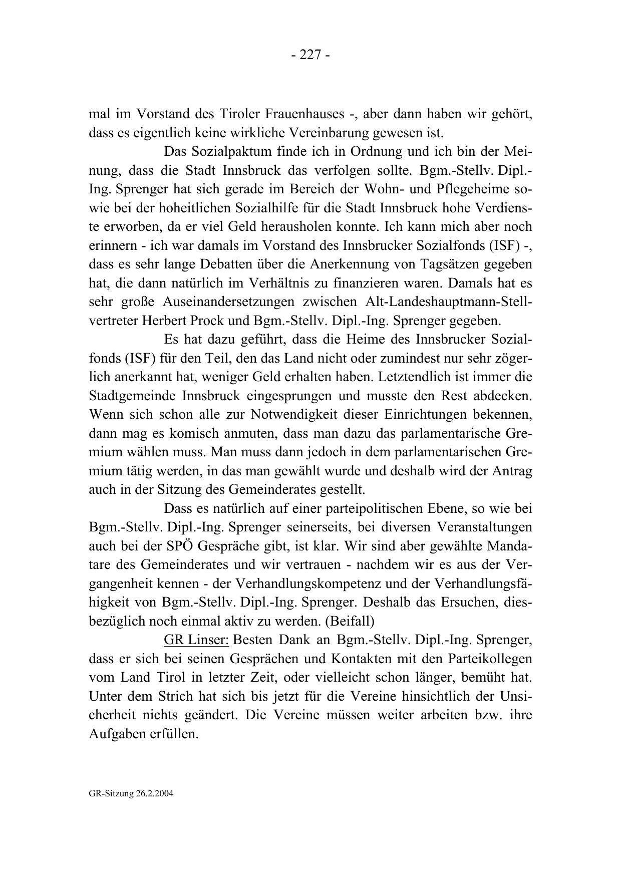 Das Sozialpaktum finde ich in Ordnung und ich bin der Meinung, dass die Stadt Innsbruck das verfolgen sollte. Bgm.-Stellv. Dipl.Ing. Sprenger hat sich gerade im Bereich der Wohn- und Pflegeheime sowie bei der hoheitlichen Sozialhilfe für die Stadt Innsbruck hohe Verdienste erworben, da er viel Geld herausholen konnte. Ich kann mich aber noch