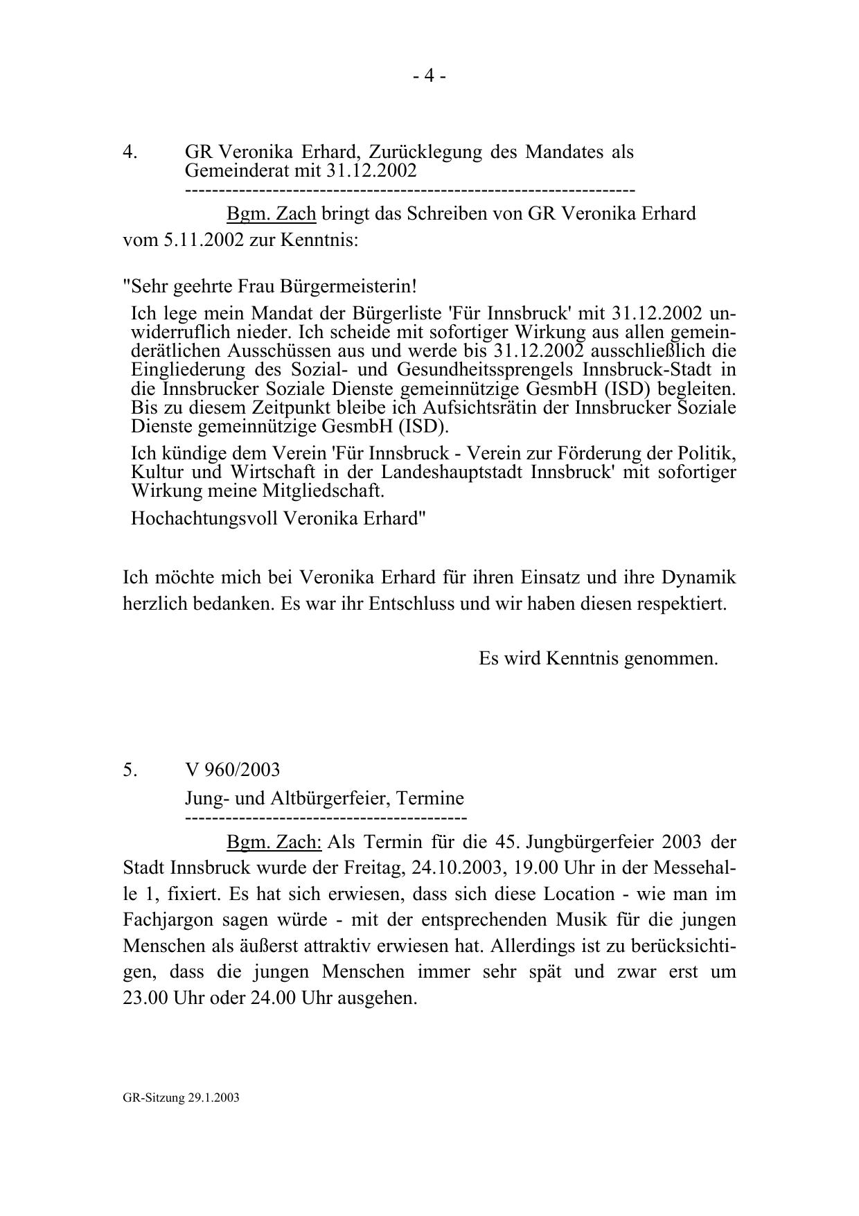 Ich lege mein Mandat der Bürgerliste "Für Innsbruck" mit 31.12.2002 unwiderruflich nieder. Ich scheide mit sofortiger Wirkung aus allen gemeinderätlichen Ausschüssen aus und werde bis 31.12.2002 ausschließlich die